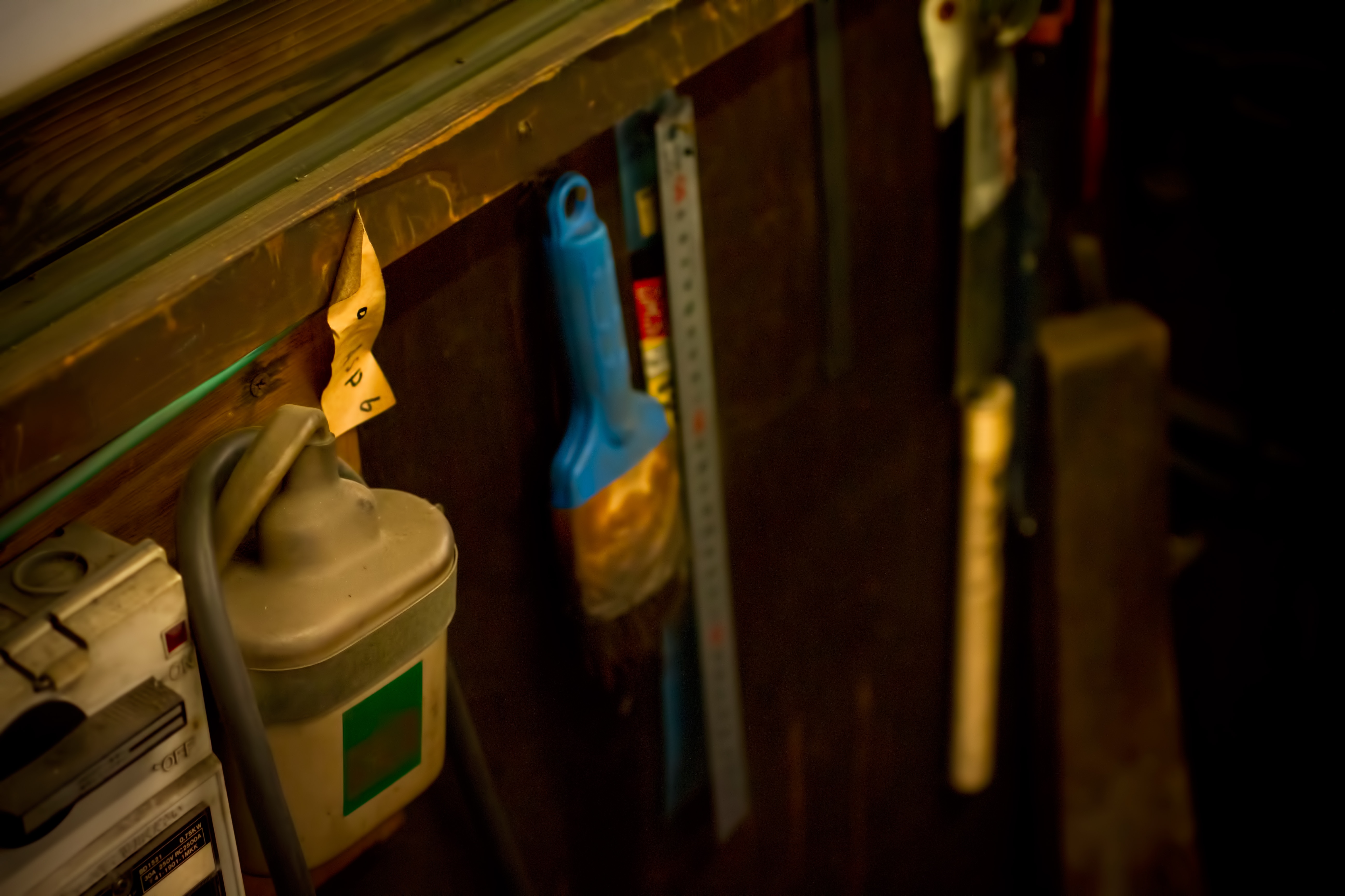 木製の壁に掛けられた道具類の写真素材です。黄色い洗濯バサミ、緑と白の容器、青い柄のブラシなどが吊り下げられています。家庭の整理整頓や工具置き場の参考素材におすすめです。