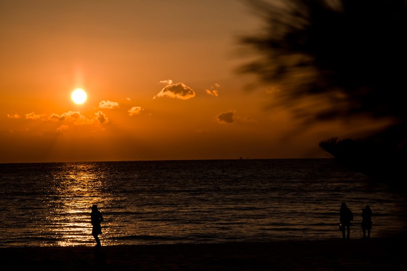 海面に光の道を作る夕日を背景に、3人の人物がシルエットで浮かぶ浜辺の写真素材です。水際に1人、砂浜に2人が立ち、空には雲が広がっています。旅行ブログのアイキャッチや夕日の風景素材におすすめです。