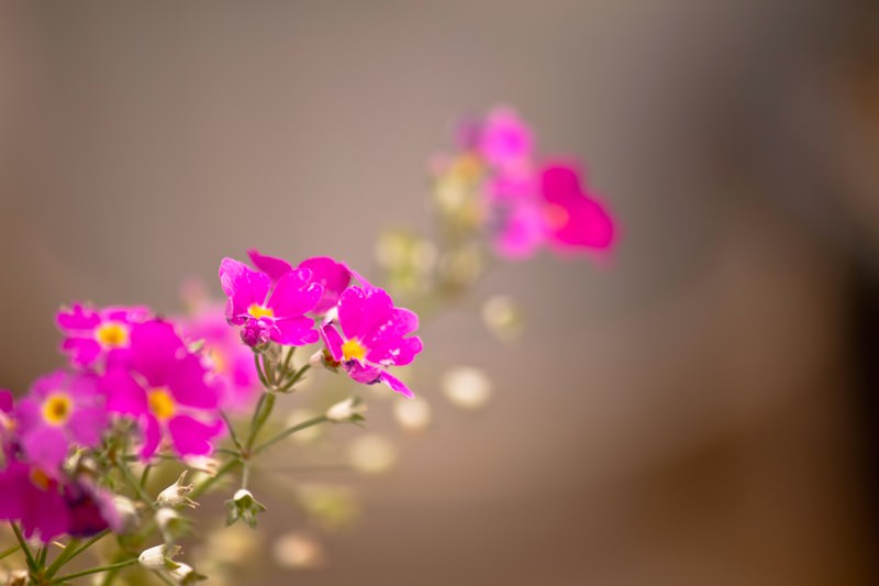 屋外の自然光の下で撮影した、ピンクの小花の写真素材です。黄色い中心を持つ花が複数集まって咲き、手前にピントが合っています。春のガーデニングや自然観察の素材におすすめです。