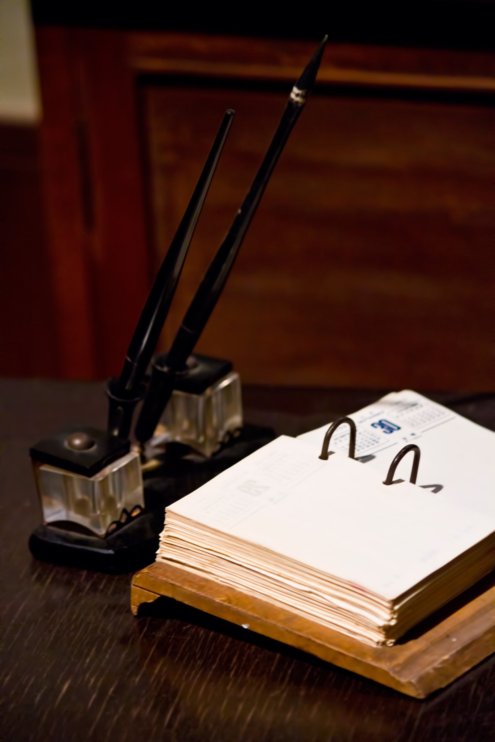 Old Desk with Ink Bottles, Pen, and White Paper Notes