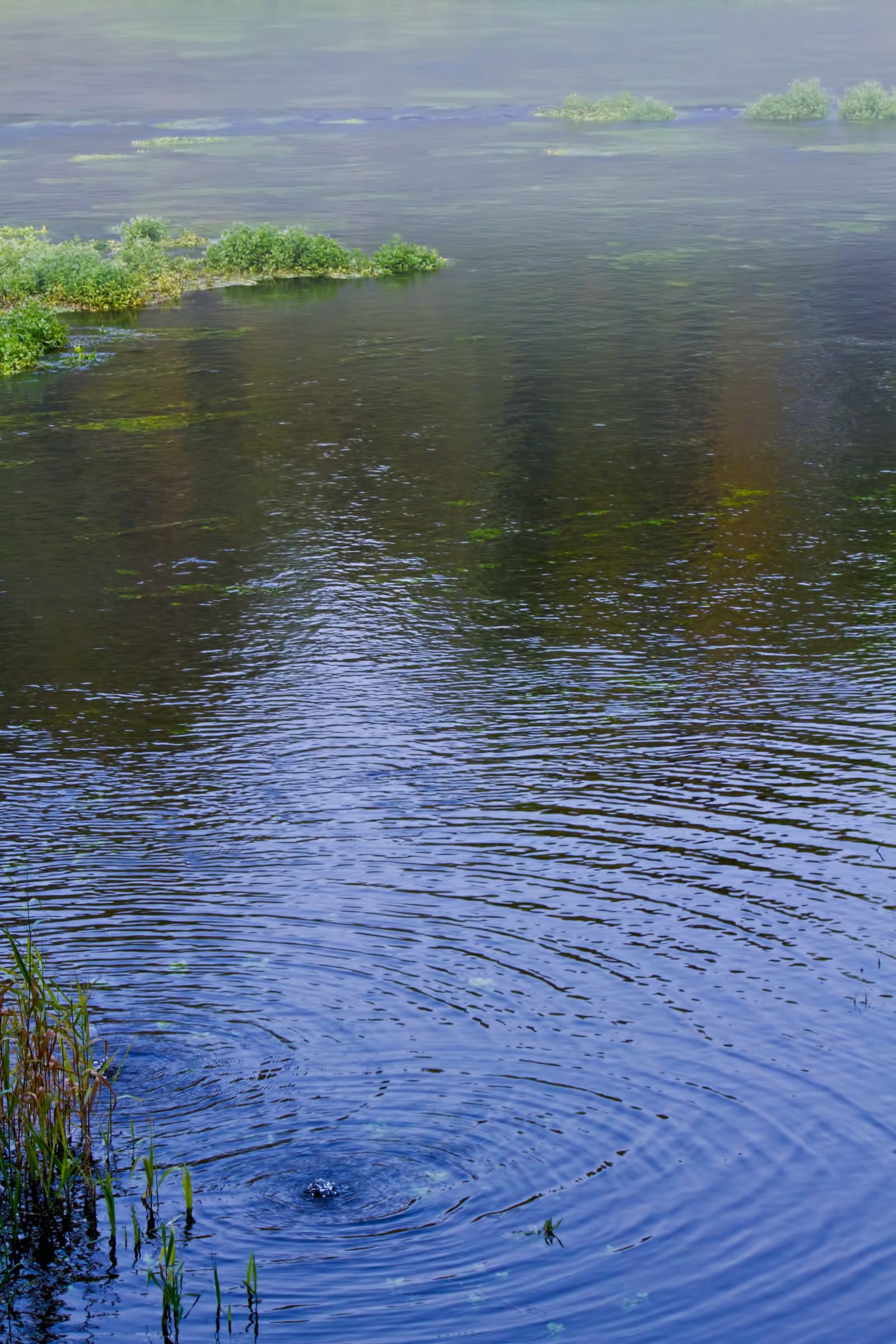 静岡県の柿田川で撮影した湧水と水辺の写真素材です。複数の波紋が水面に広がり、奥に緑の低木が点在しています。湧水や自然風景の素材におすすめです。