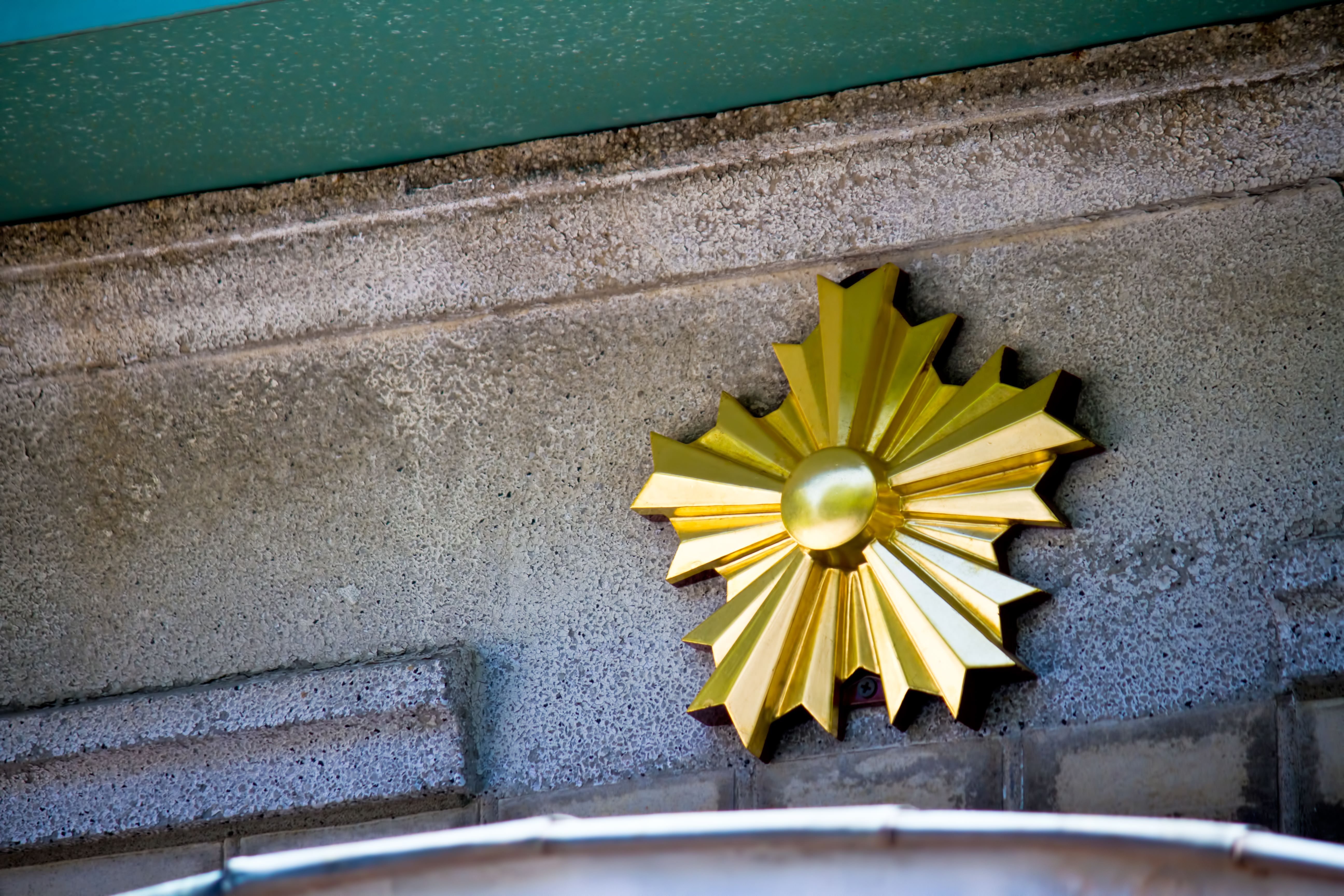 交番の外壁に取り付けられた金色の星形エンブレムを撮影した写真素材です。放射状に広がる立体的な形で、上部には緑の庇が見えます。警察や公共施設を紹介するコンテンツにおすすめです。