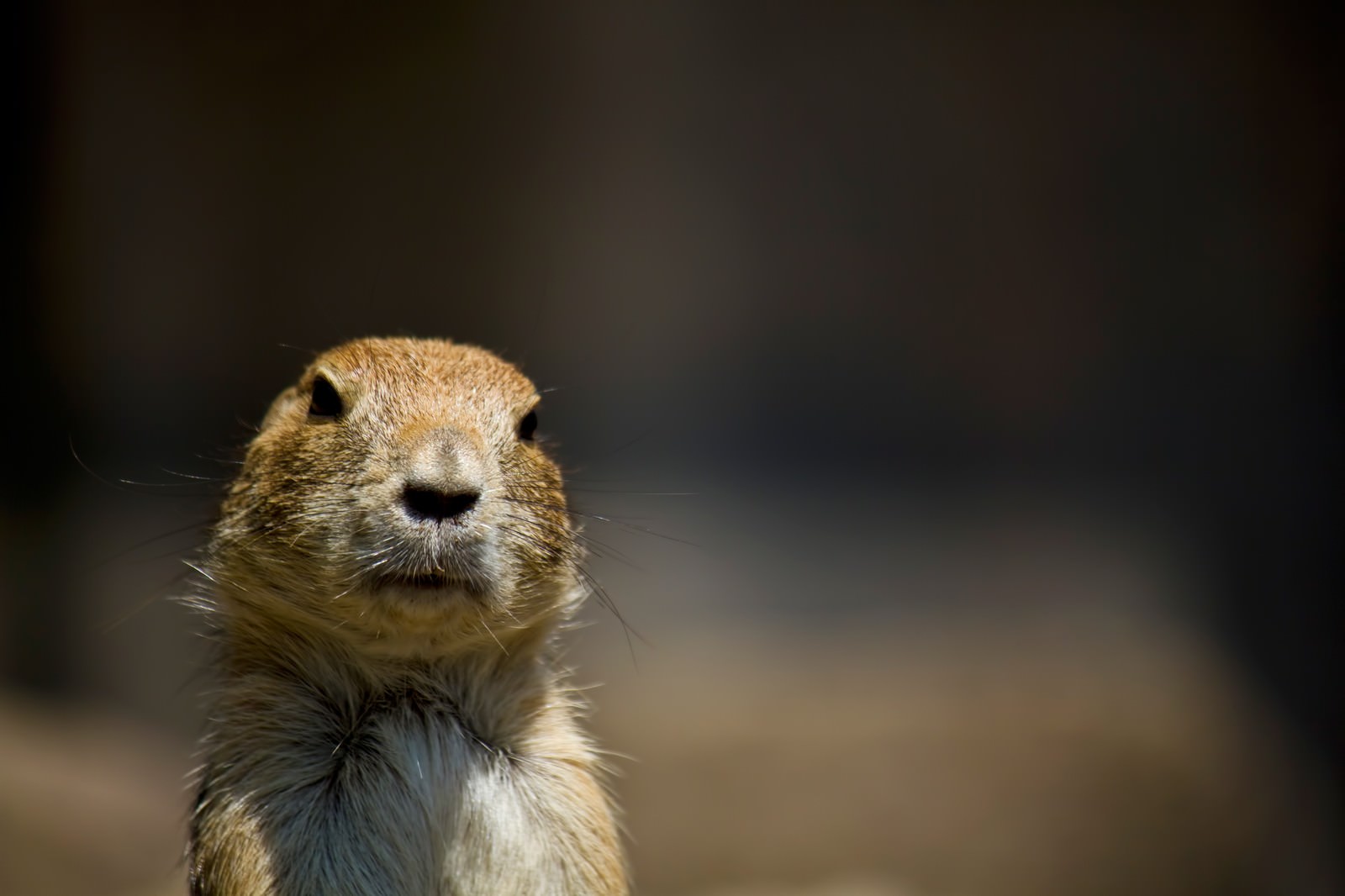 正面を向いて立つプレーリードッグの写真素材です。茶色と白の毛並みにひげが見え、暗い背景にぼけています。動物園やかわいい動物素材におすすめです。