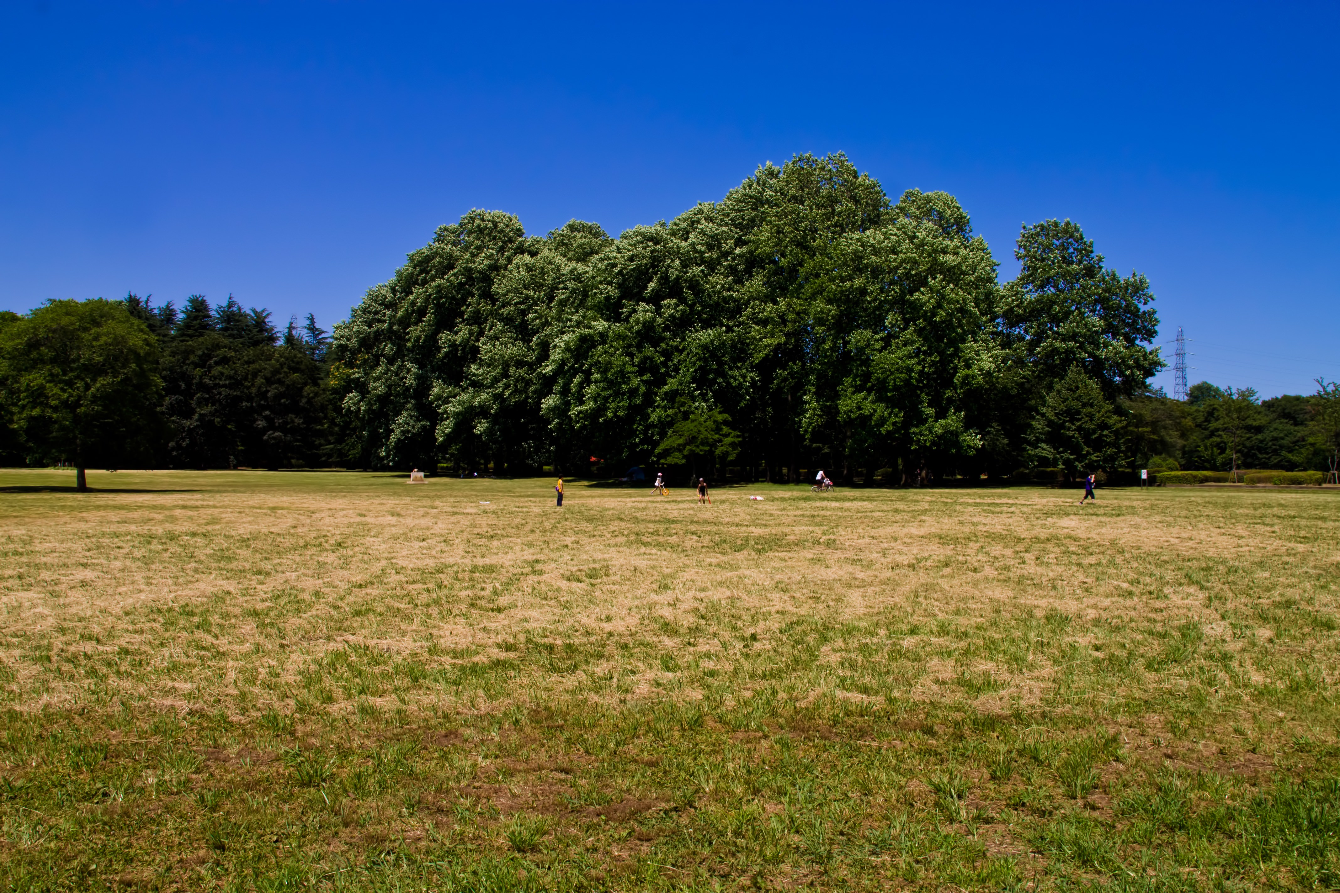 晴れた日の公園に人が点在する写真素材です。広い芝生の奥に緑の木が並び、開放的な空間が広がっています。公園やレジャーのイメージ素材におすすめです。