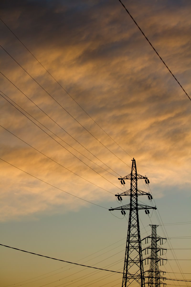 Power Transmission Towers Silhouetted at Sunset