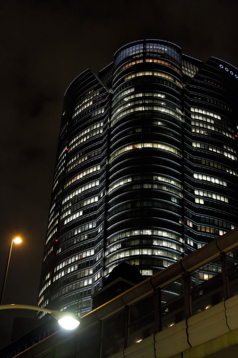 夜の首都高越しに見上げた六本木ヒルズの写真素材です。波打つ曲線デザインのビルに窓の明かりが灯り、手前に歩道橋の手すりが写っています。東京の夜景や都市素材におすすめです。