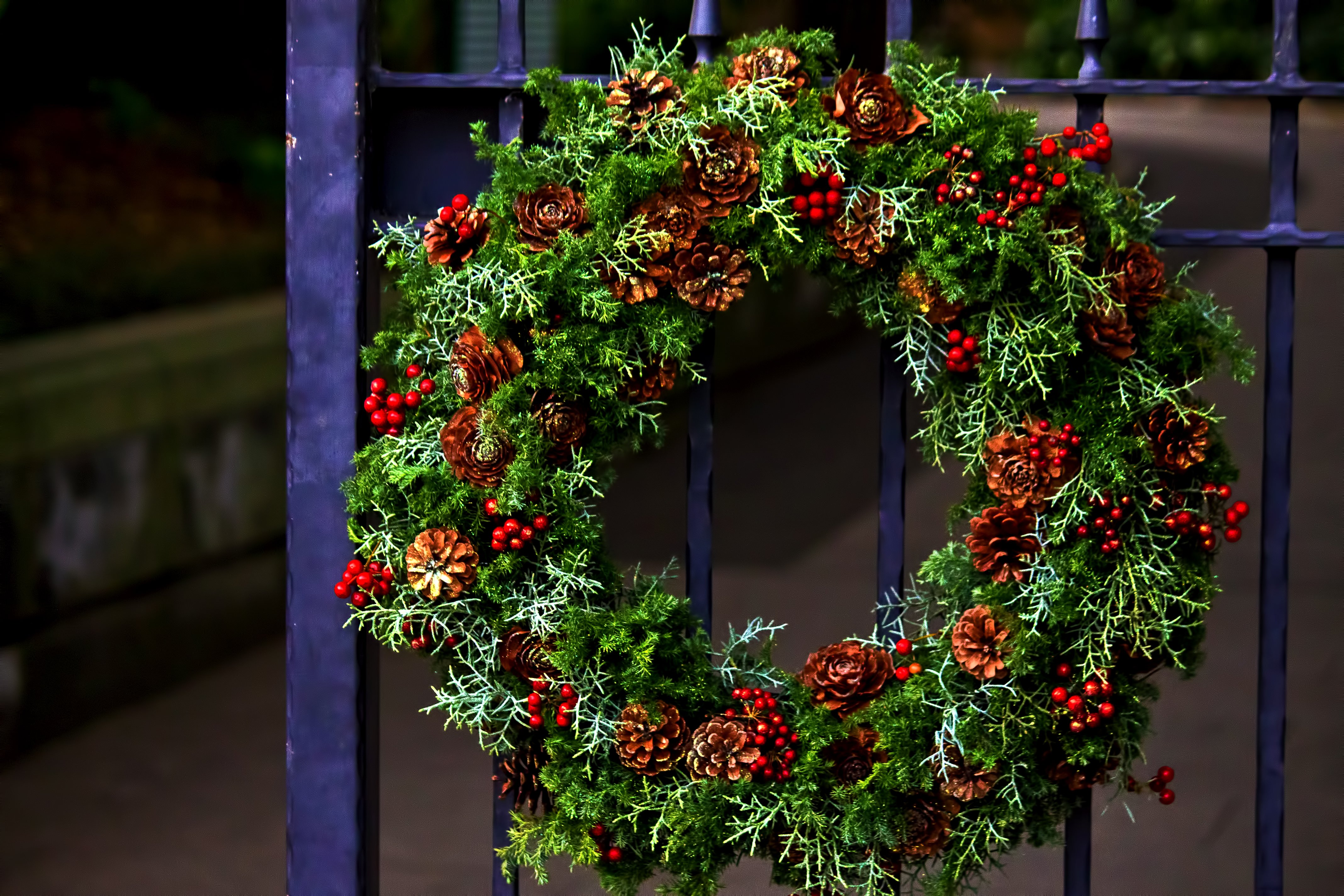 緑の葉と松ぼっくり、赤い実で作られたクリスマスリースの写真素材です。紫色の柵に飾られ、正面から撮影されています。クリスマス装飾や季節素材におすすめです。