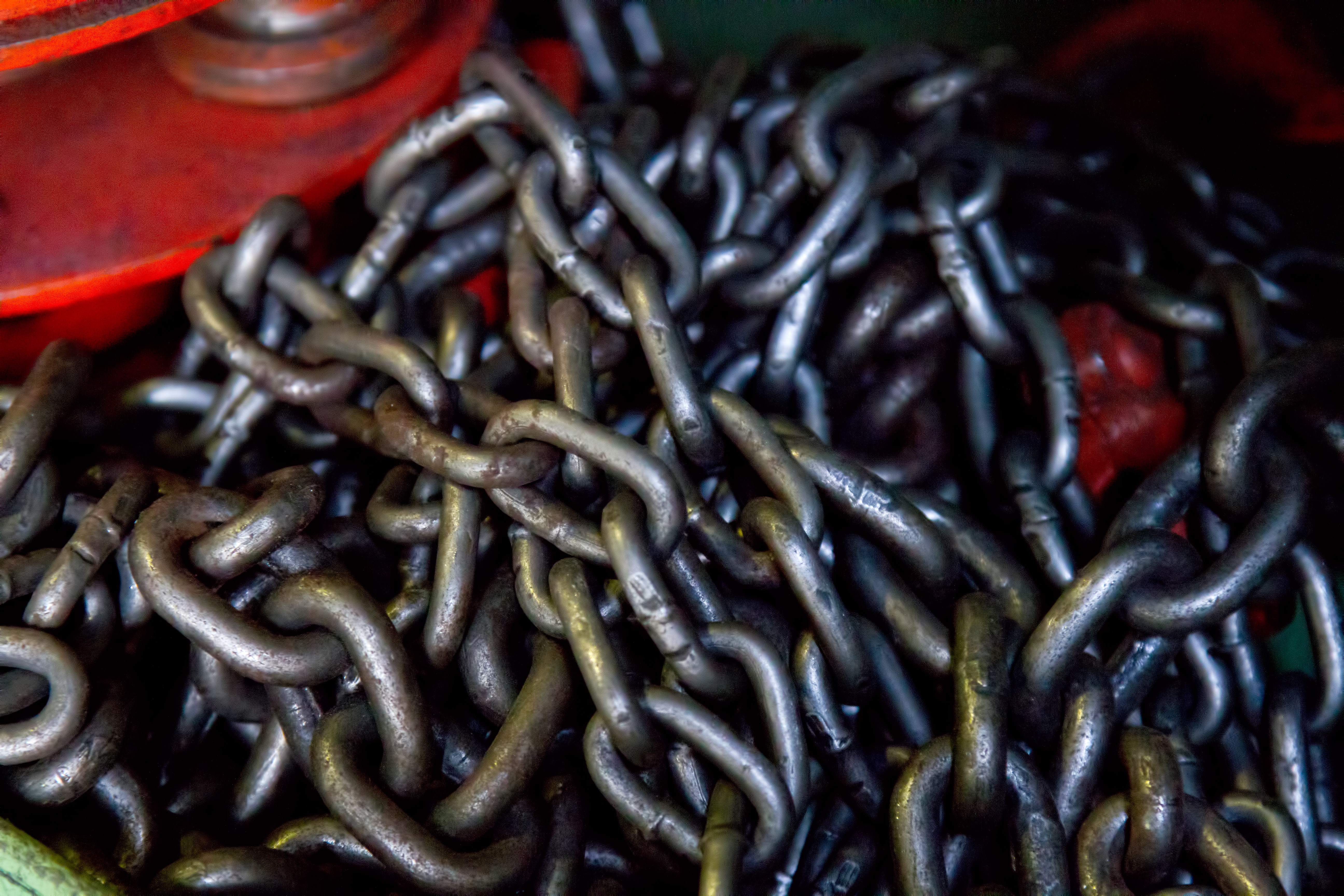 赤いプラスチック容器に積まれた錆びた鎖の写真素材です。黒や茶色の汚れやさびが付いた金属製の鎖が絡まり合っています。工業用品や古い道具の素材におすすめです。
