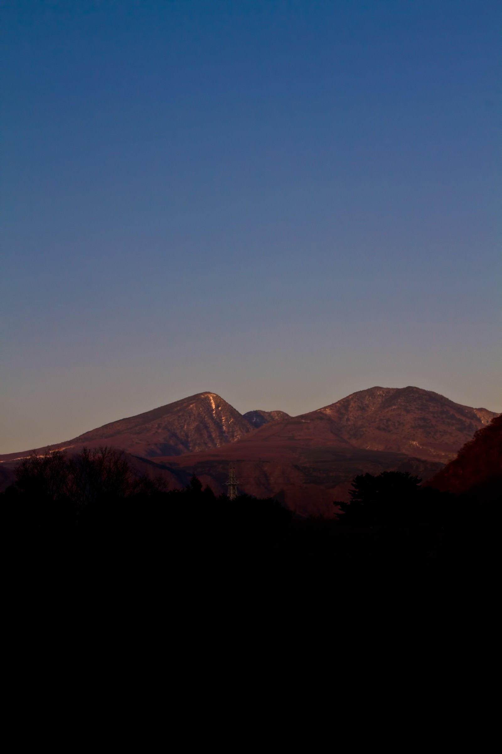 夕暮れ時の山並みの写真素材です。岩肌が見える複数の山頂が連なり、空は青からオレンジに変わるグラデーションに染まっています。山の風景や季節素材におすすめです。