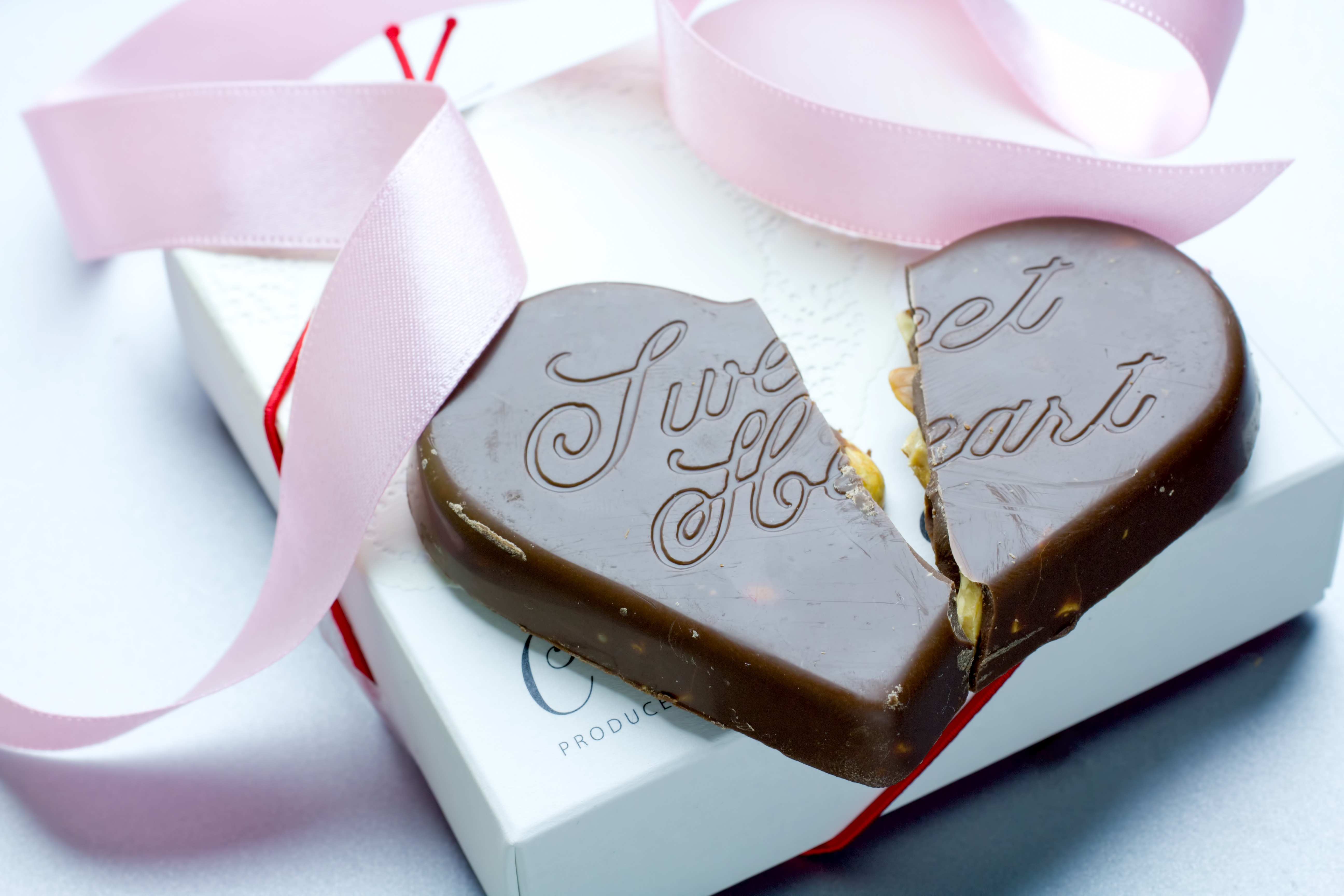 Broken Heart Chocolate on Gift Box with Pink Ribbon