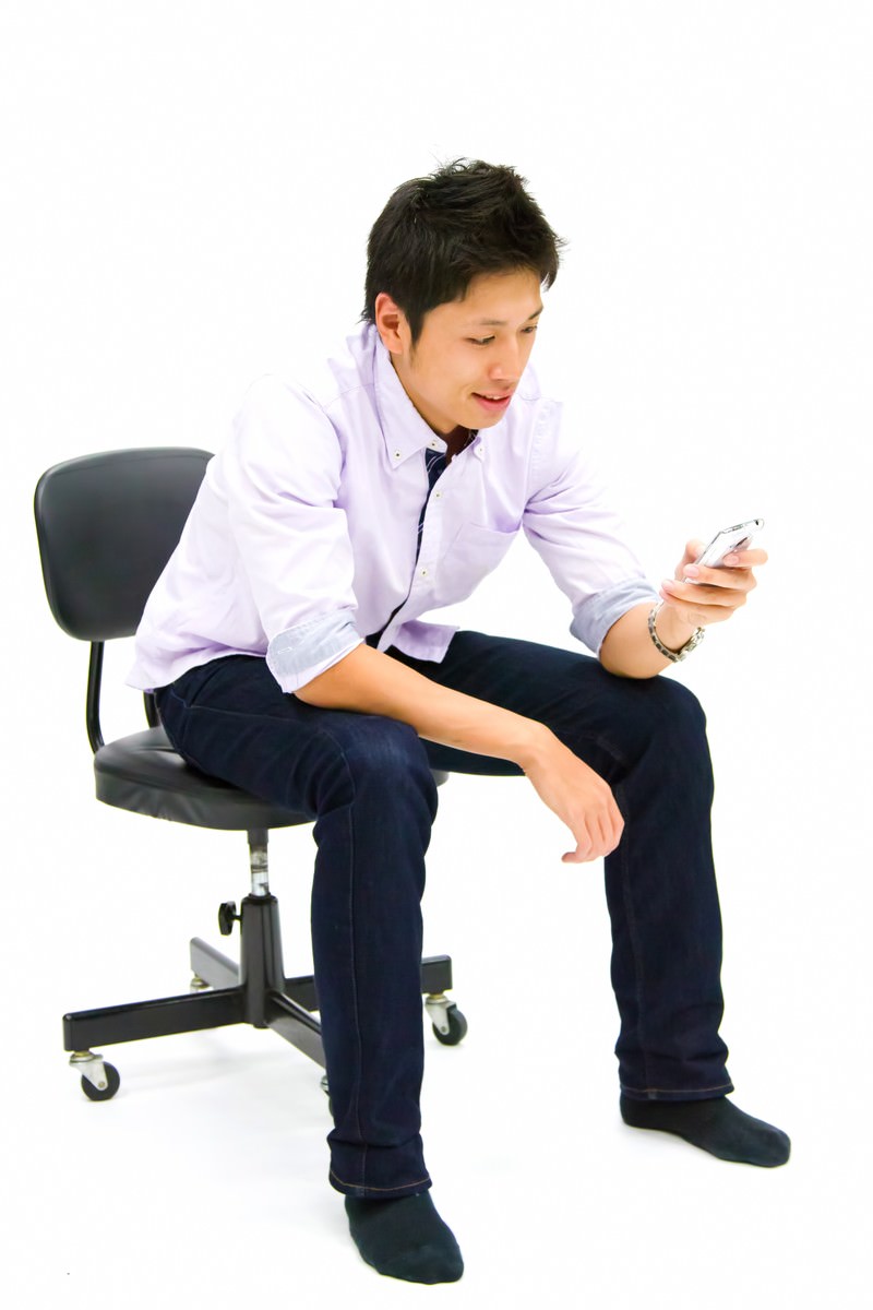 携帯電話を操作する青年の写真素材です。青いシャツとベスト姿の男性がスマートフォンの画面を見ています。人物やスマホ操作素材におすすめです。