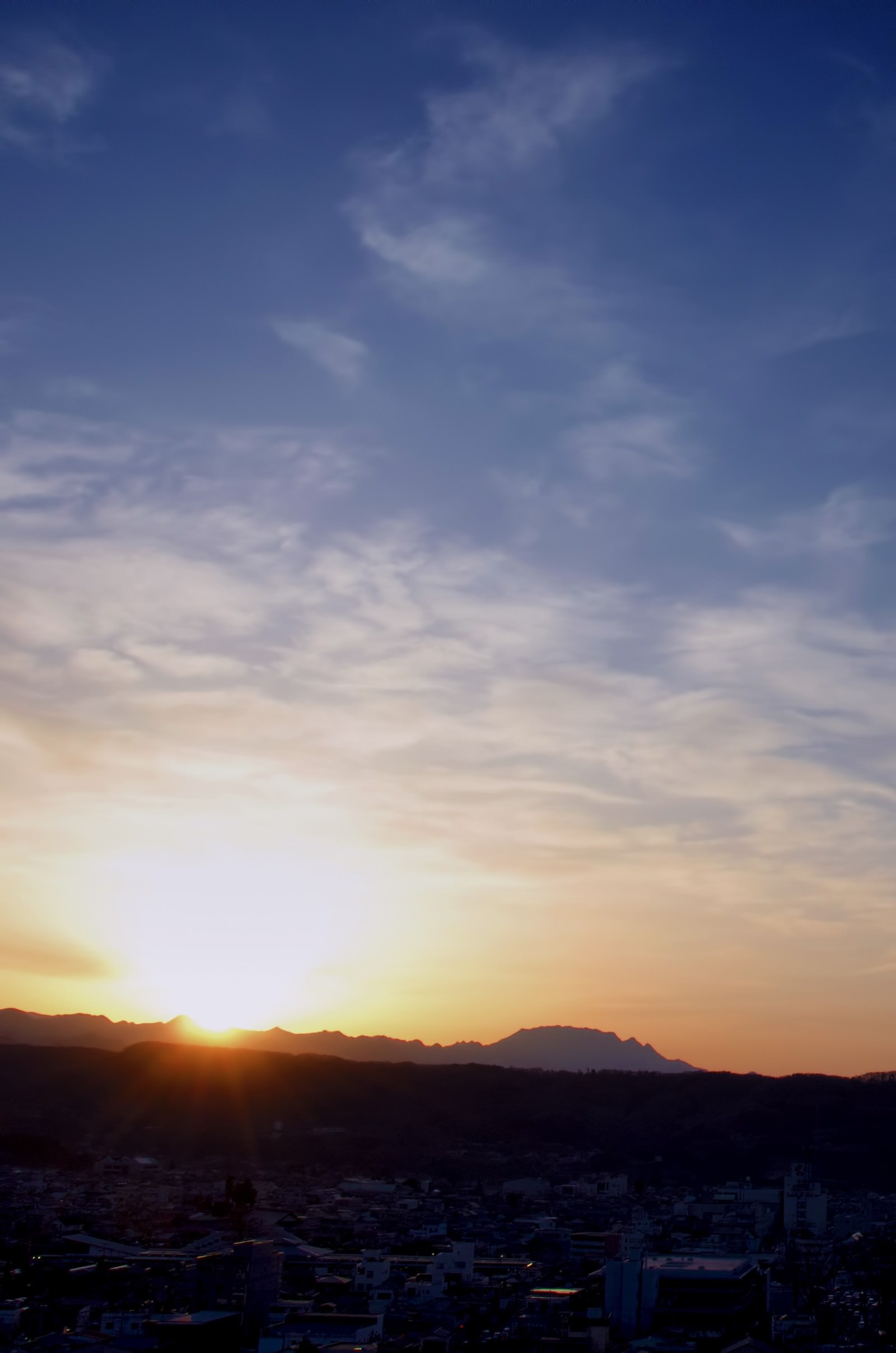 日没前の山なみの写真素材です。空が青からオレンジに変わるグラデーションの中に山の輪郭が浮かんでいます。夕景や山の風景素材におすすめです。