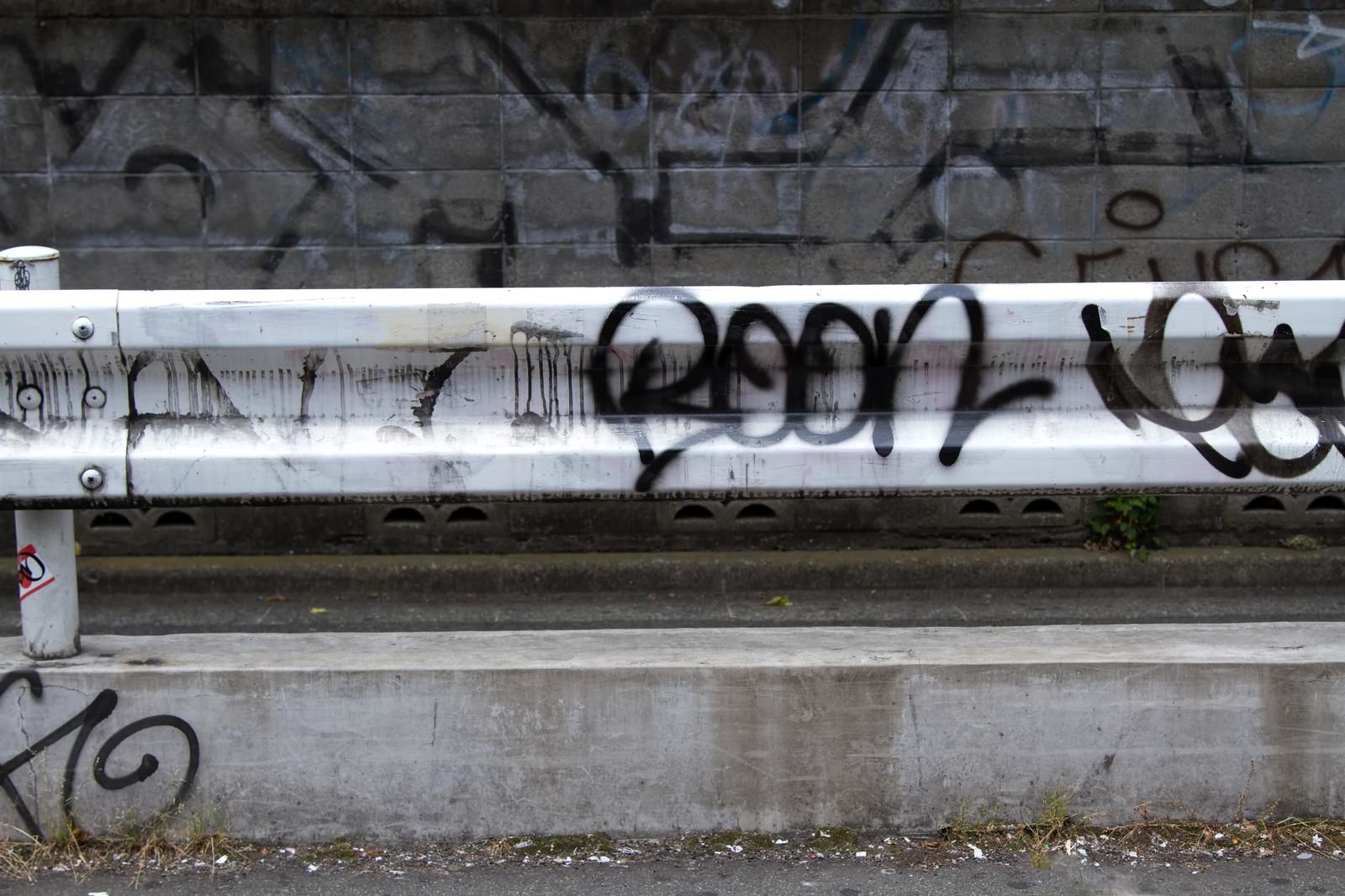スプレーの落書きが描かれたブロック塀の写真素材です。コンクリートの壁面にカラフルな落書きが写っています。ストリートやテクスチャ素材におすすめです。