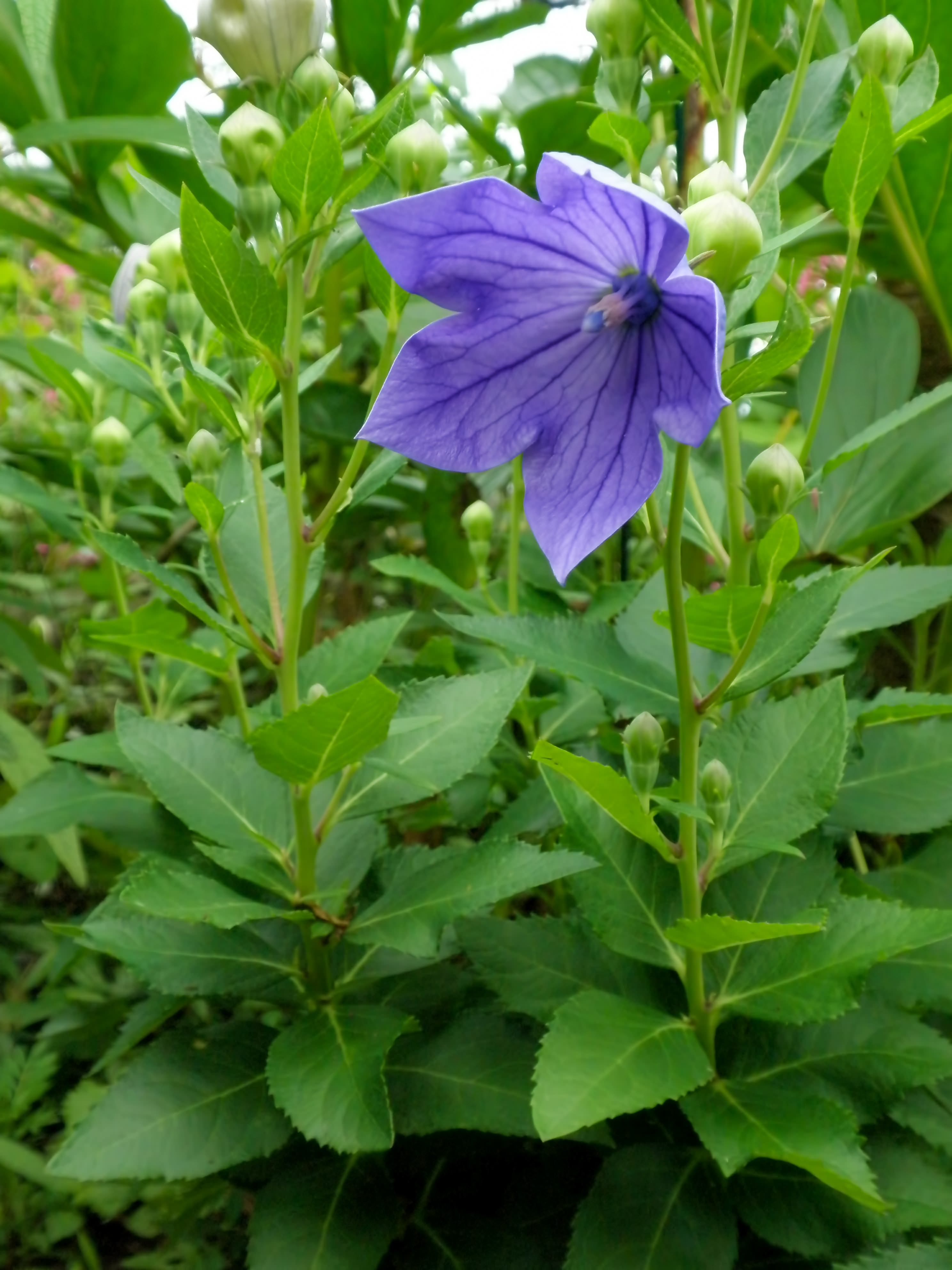 屋外の庭で自然光の下、桔梗の花とつぼみを撮影した写真素材です。五枚の花びらの中心に濃い紫の筋模様があり、まわりに緑のつぼみが複数あります。和のイメージや季節の花コンテンツにおすすめです。