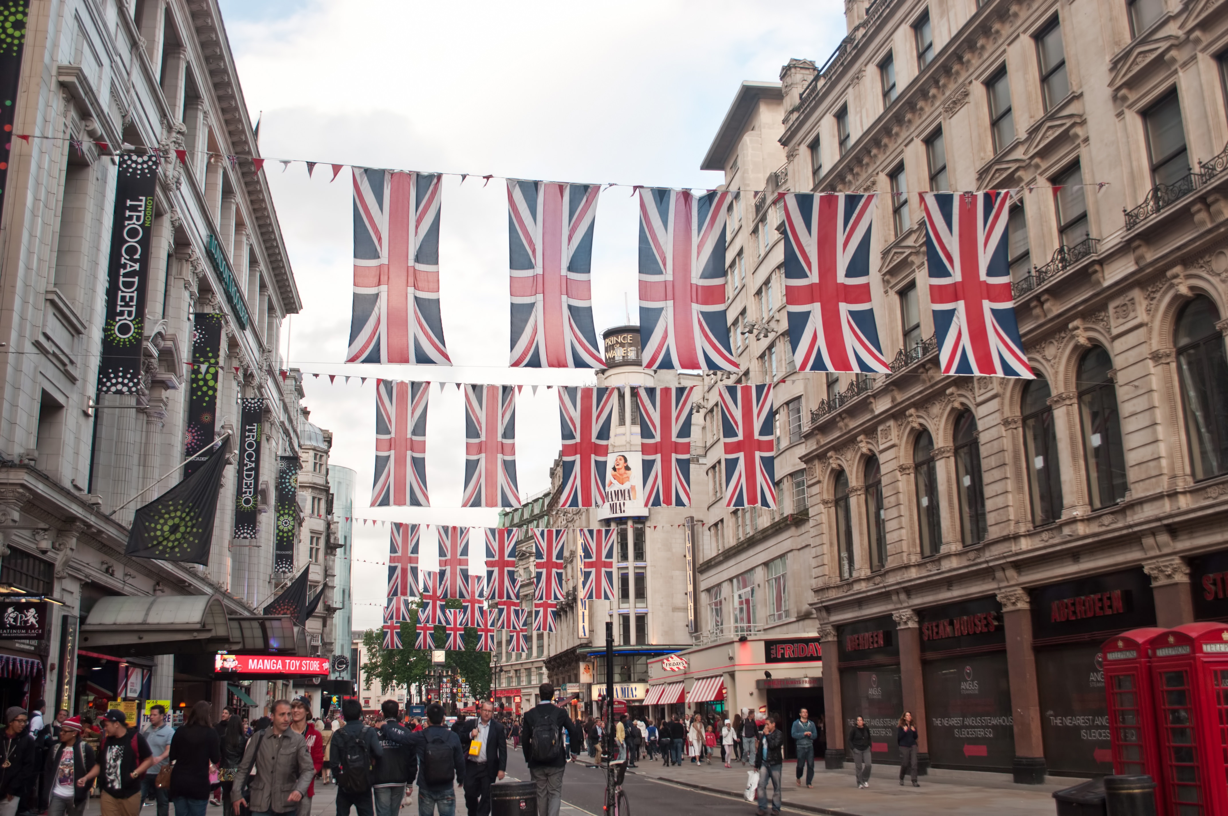 通りにユニオンジャックが並ぶ、ピカデリー付近の都市風景の写真素材です。両側に多階建ての建物が続き、多くの人が歩いています。ロンドンの観光・旅行素材におすすめです。