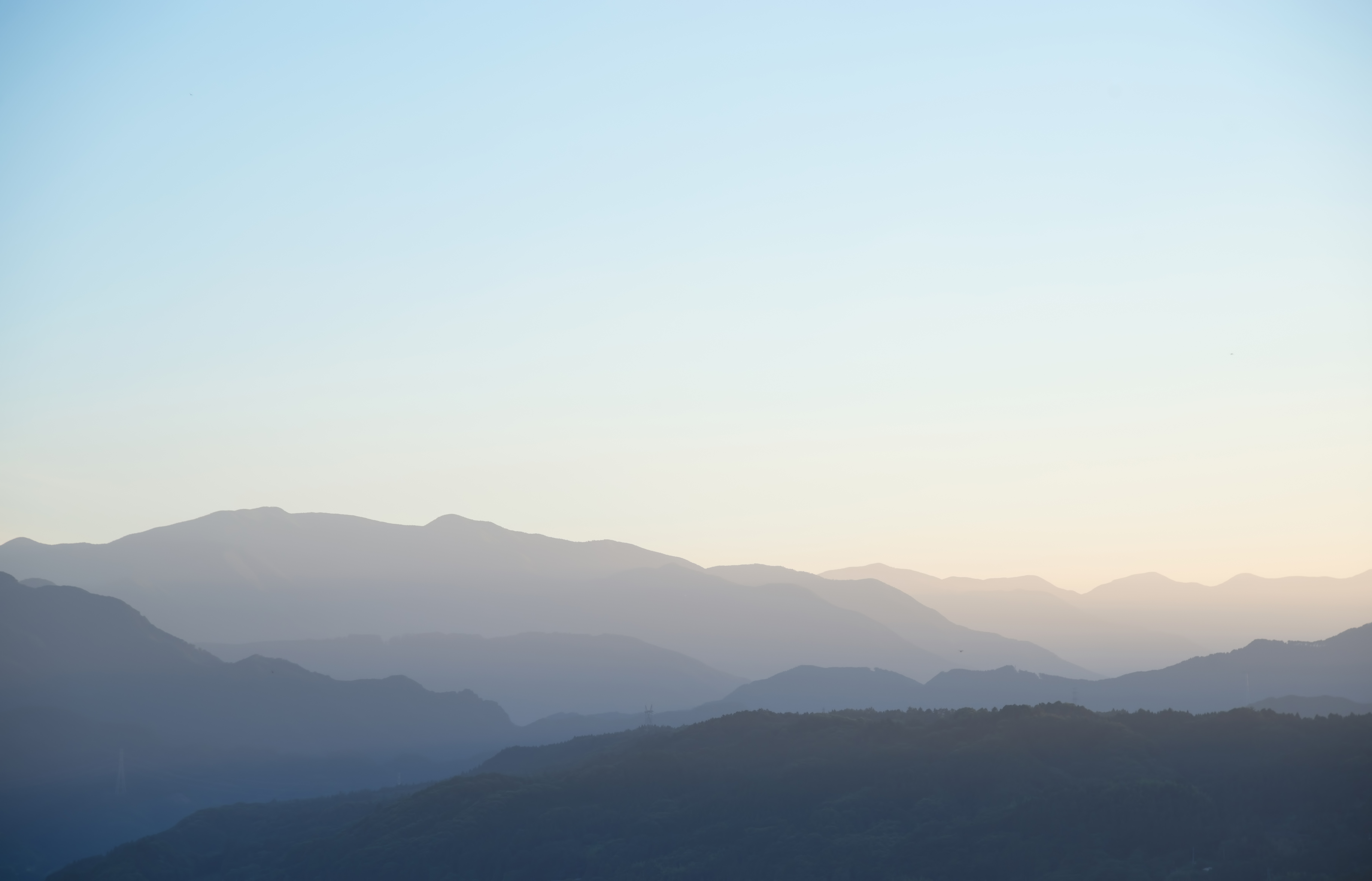 霧深い山々の写真素材です。緑の山が霧に包まれています。山岳風景や自然素材におすすめです。