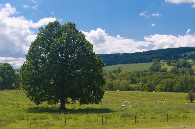 ひつじと大きな木の写真素材です。緑の牧場で大きな木の陰にひつじがいます。牧場や動物素材におすすめです。