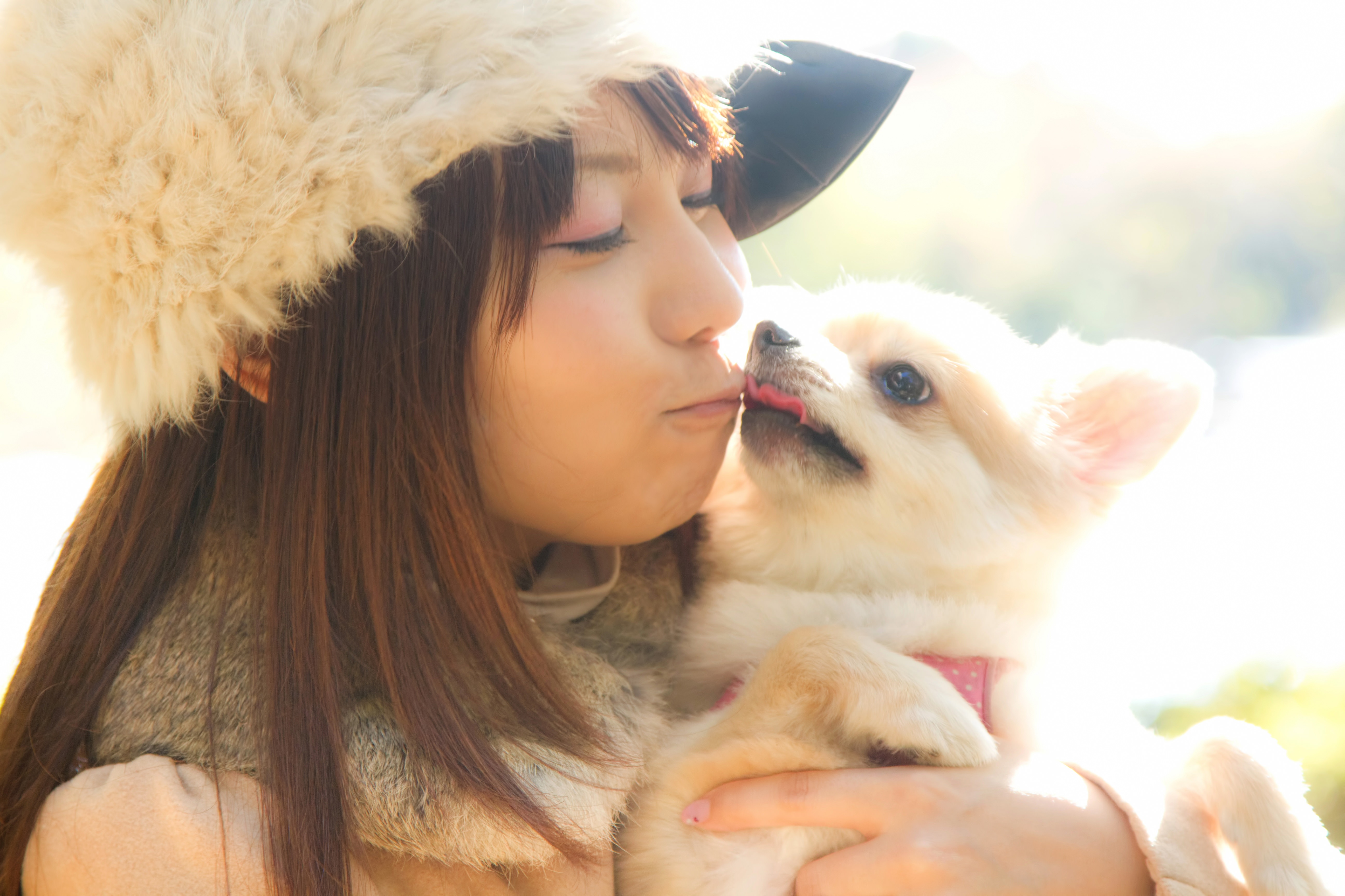 コーギーの子犬にキスをする女性の写真素材です。ロシア帽をかぶった女性が子犬の鼻先に唇を寄せています。ペット関連のコンテンツや愛犬との生活を伝える記事におすすめです。
