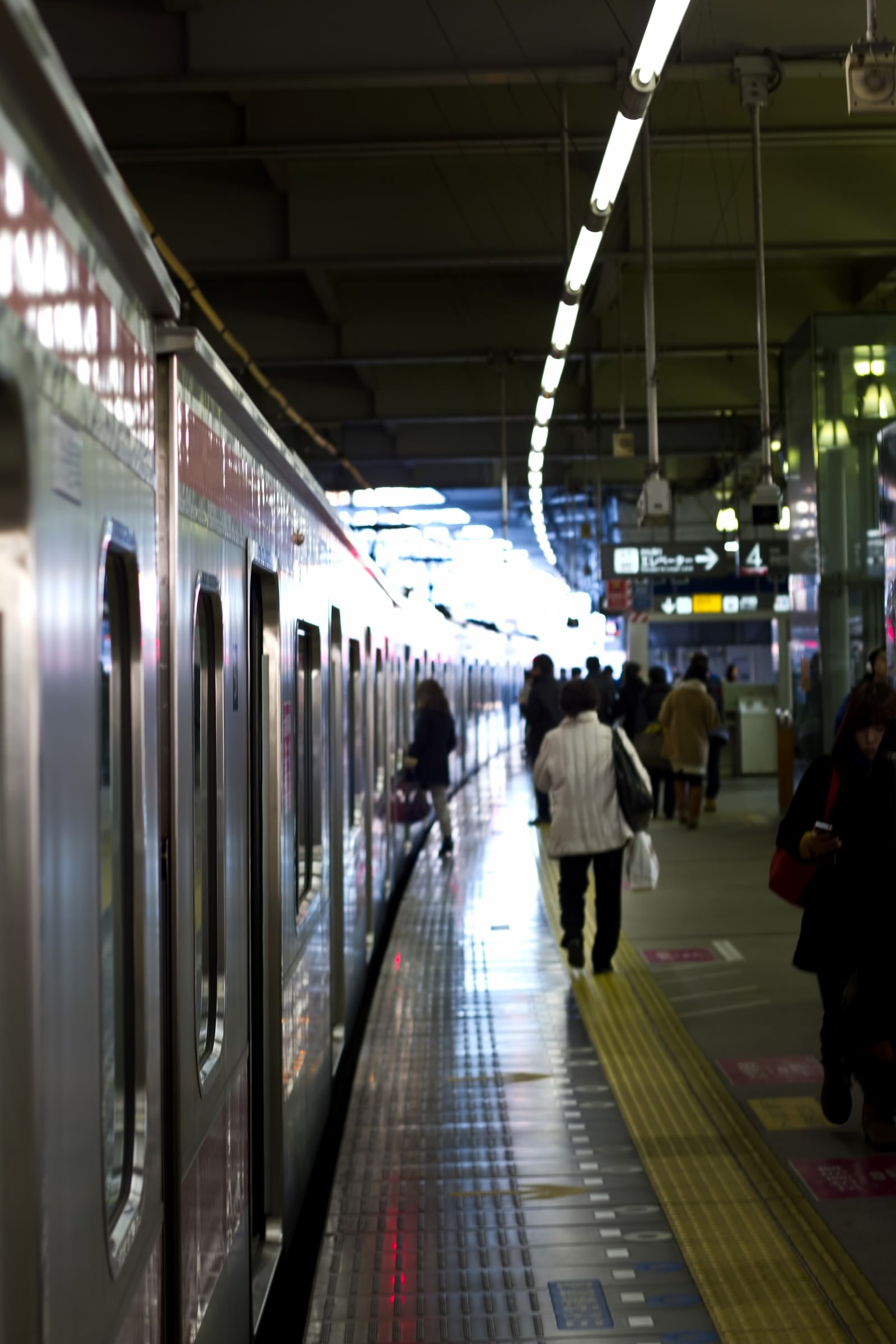 電車と駅のホームの写真素材です。電車が停車して乗降客がいます。鉄道や通勤素材におすすめです。