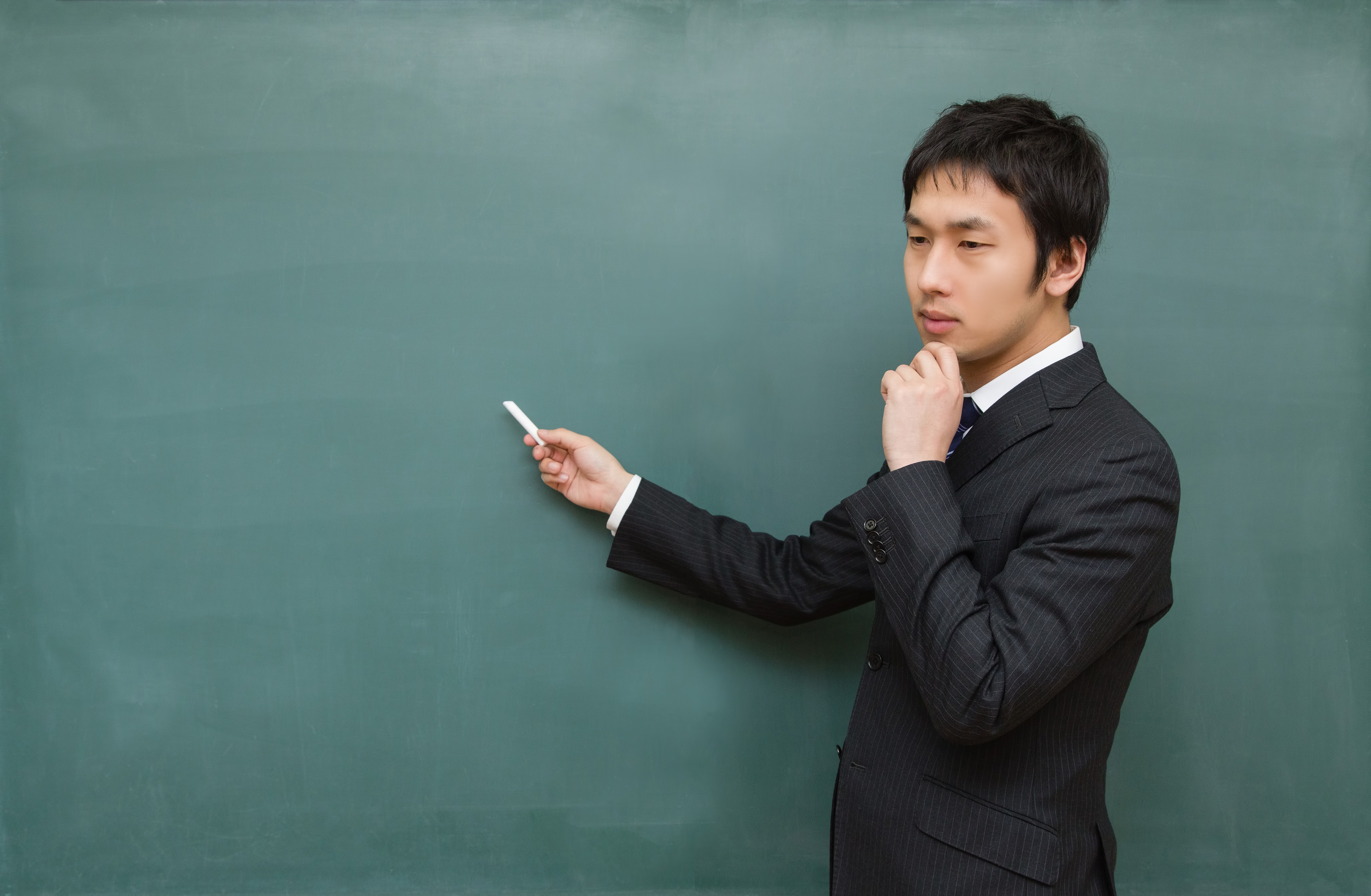 黒板に向かって考える先生の写真素材です。チョークを当てたまま考え込んでいます。教育や思考素材におすすめです。