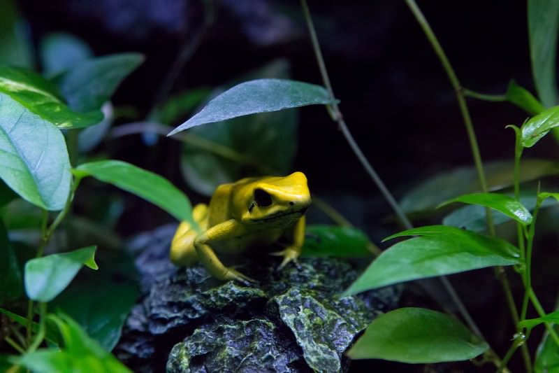 岩の上に座る黄色いカエルの写真素材です。緑の葉の間から正面を向いた毒ガエルが写っている。動物や生き物を扱うコンテンツにご利用いただけます。