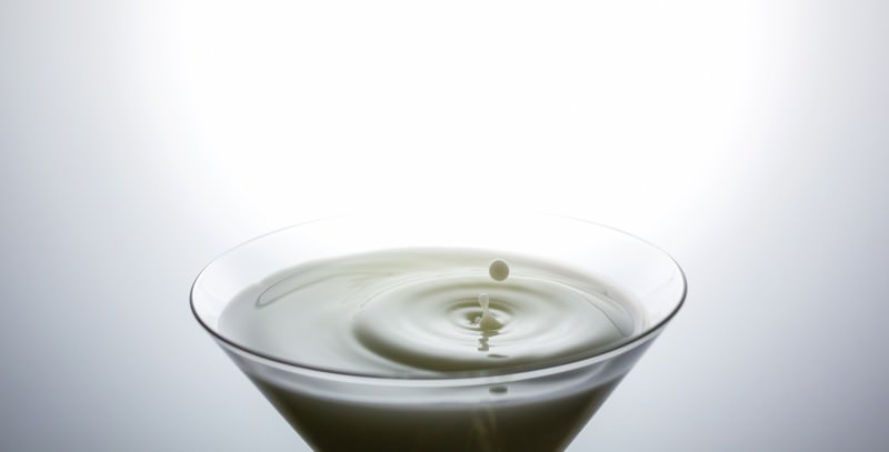 グラスに入った液体の表面に水滴が落ちて波紋と飛沫が生まれる瞬間の写真素材です。明るい照明で無地背景から撮影した構図。飲料広告や瞬間撮影の記事素材におすすめです。