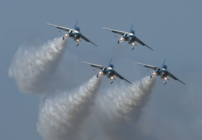 ブルーインパルス4機が編隊を組んで飛行する写真素材です。青白の機体から白いスモークを噴き出しながら横並びで飛ぶ姿が写っています。航空ショーや自衛隊関連の記事に使えます。