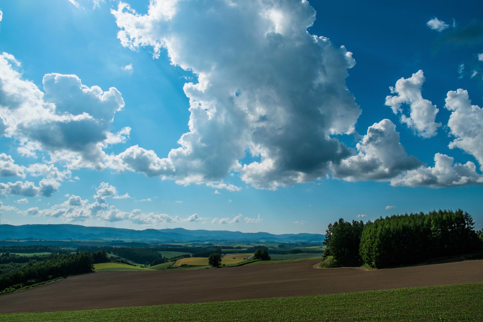 広がる畑と林、大きな雲が空に浮かぶ北海道の風景写真素材です。遠くに山並みが見え、空を広く撮影した横長の構図。北海道の自然や風景の記事素材におすすめです。