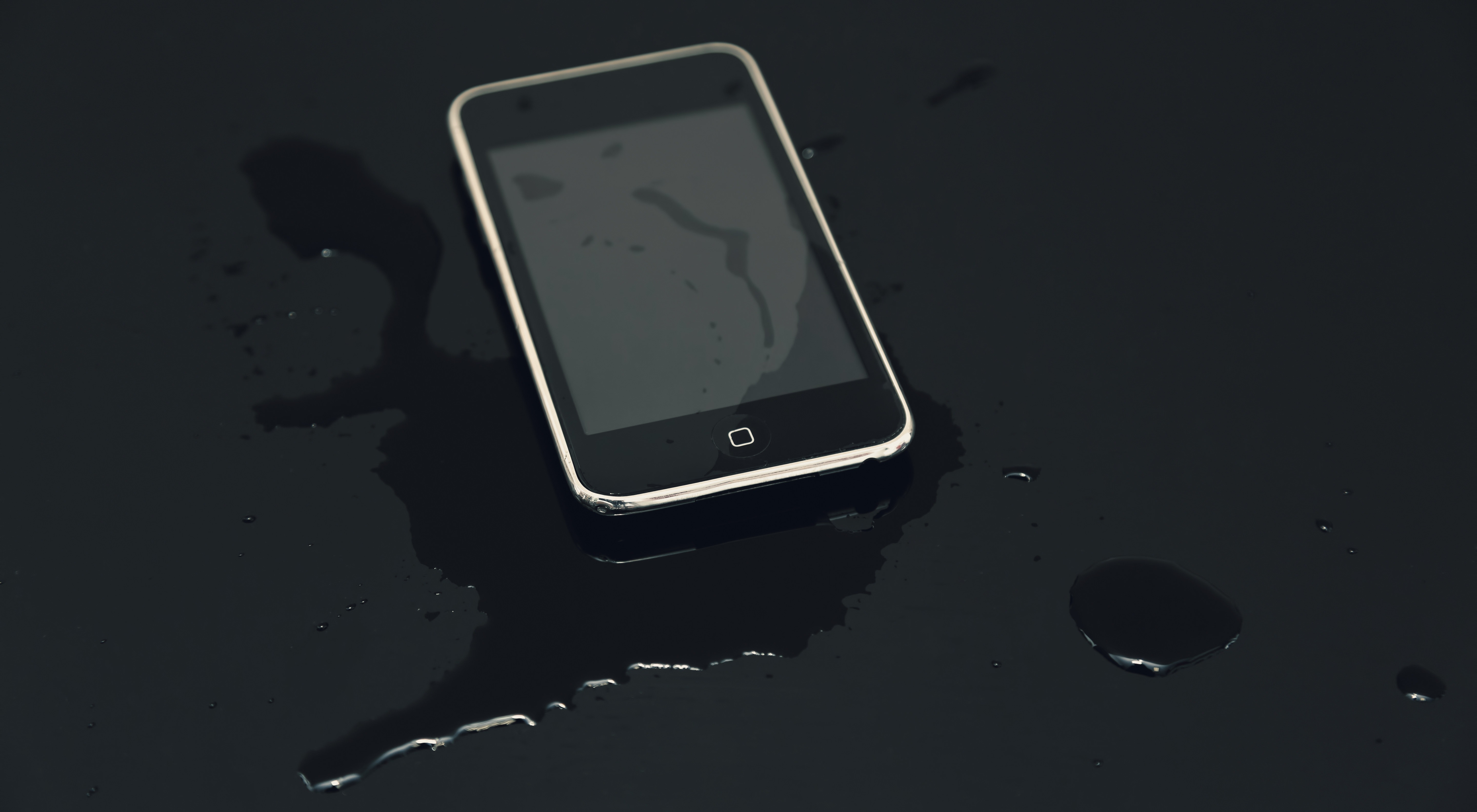 水滴がついたスマートフォンの写真素材です。画面に地図が表示されています。暗い場所で水たまりの中に置かれています。スマホの防水機能や雨天利用の紹介記事などに使えます。