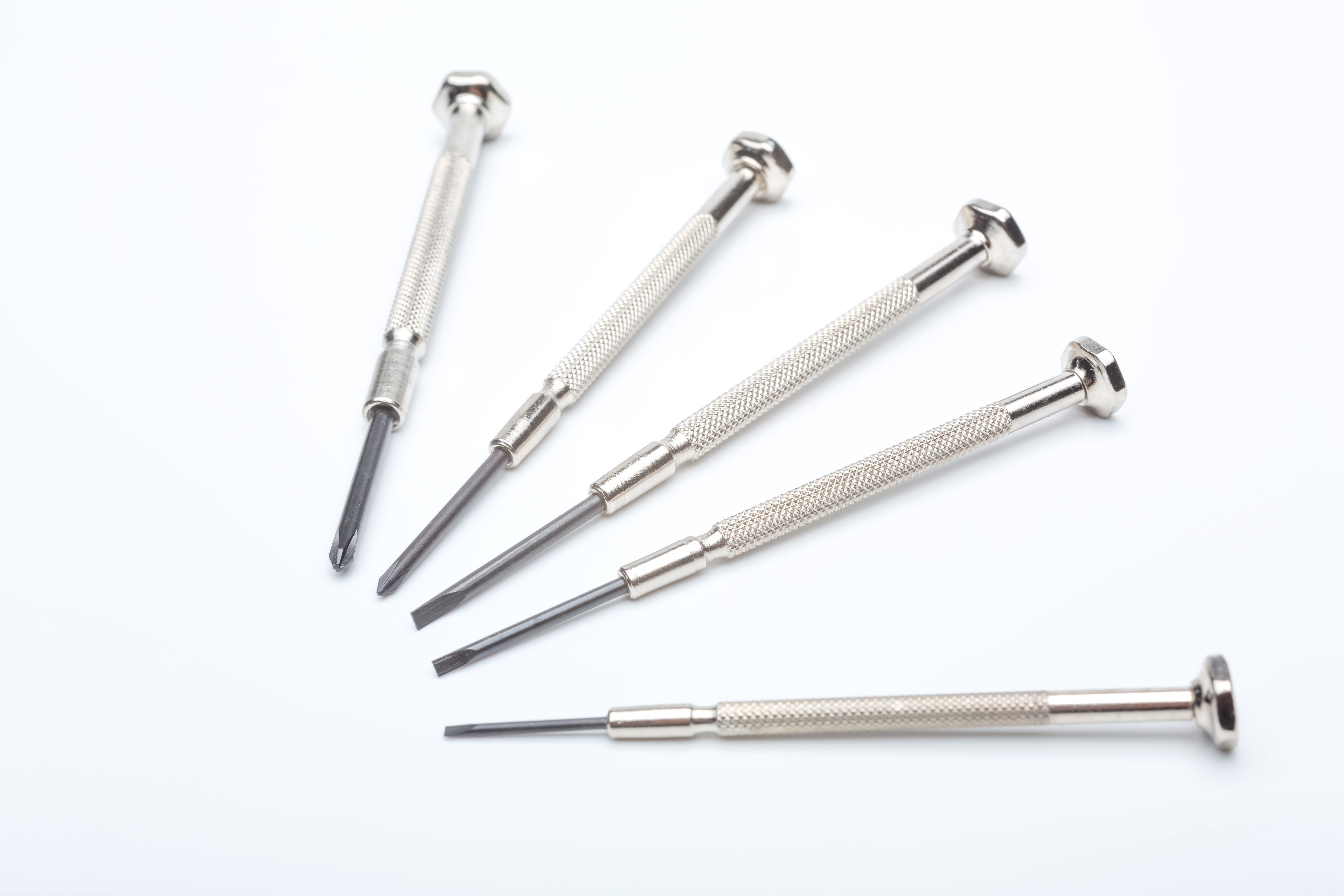 精密ドライバー5本が白い面に並んだ写真素材です。金属製で持ち手に細かい溝があり、先端は平らやとがった形をしています。真上から撮影されています。工具紹介や修理関連の記事などに使えます。