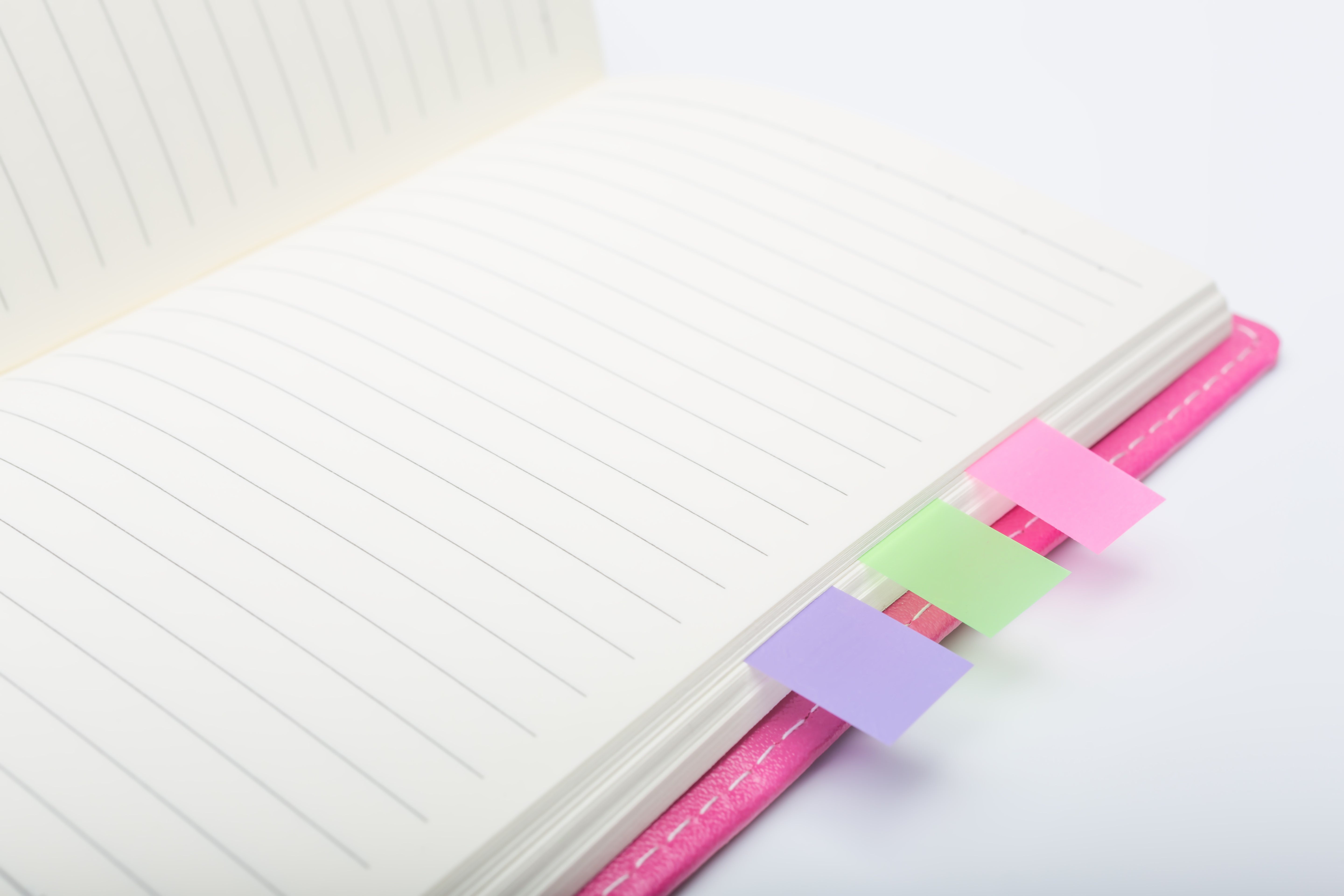 横線入りのノートにカラフルな付箋が挟まった写真素材です。紫や緑、ピンクの付箋が差し込まれ、右端にピンク色の定規が置かれています。勉強やスケジュール管理の記事などに使えます。