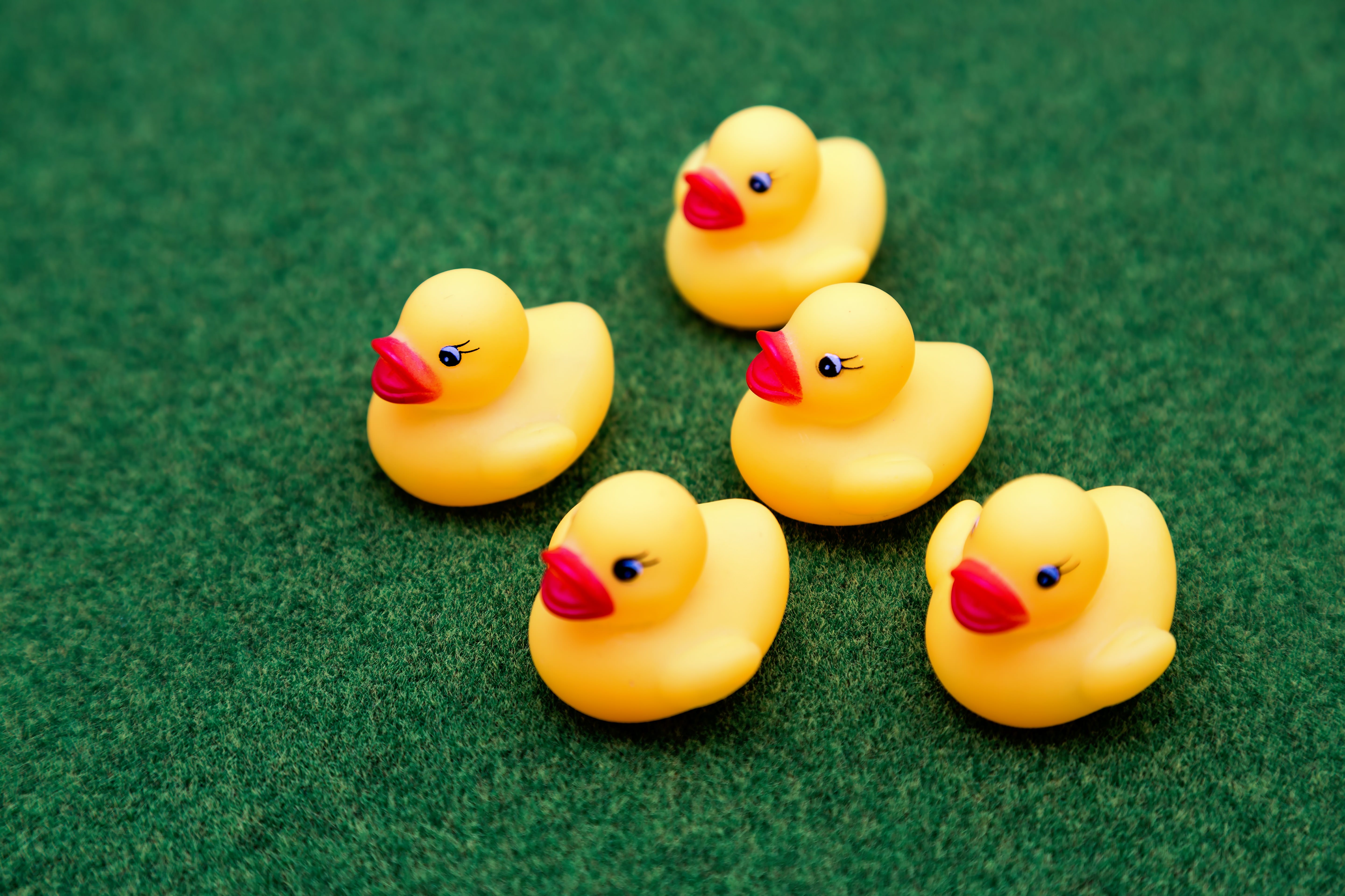 緑色の布の上に黄色いアヒルのおもちゃ5個が並んだ写真素材です。赤いくちばしと青い目が描かれたゴム製のアヒルが真上から撮影されています。お風呂用品や子ども向けコンテンツの記事などに使えます。
