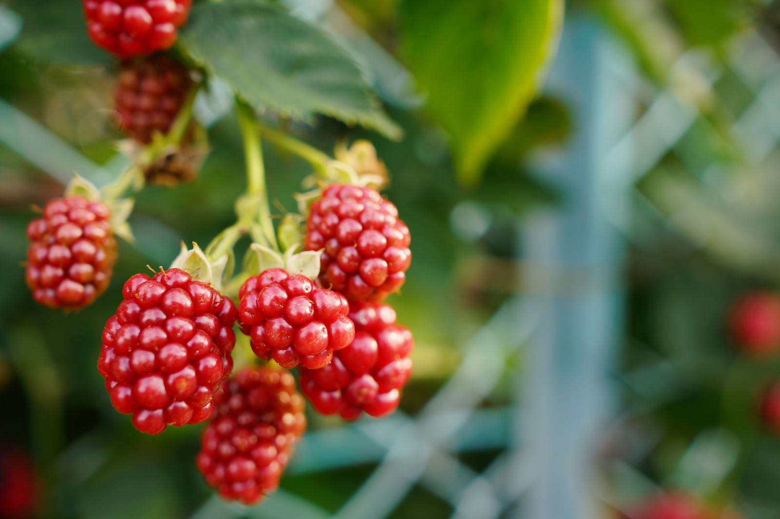 赤い野イチゴの実が房状に集まった写真素材です。小さな粒が寄り集まって実を形成しています。緑の葉の中で撮影されています。自然観察や植物の記事などに使えます。