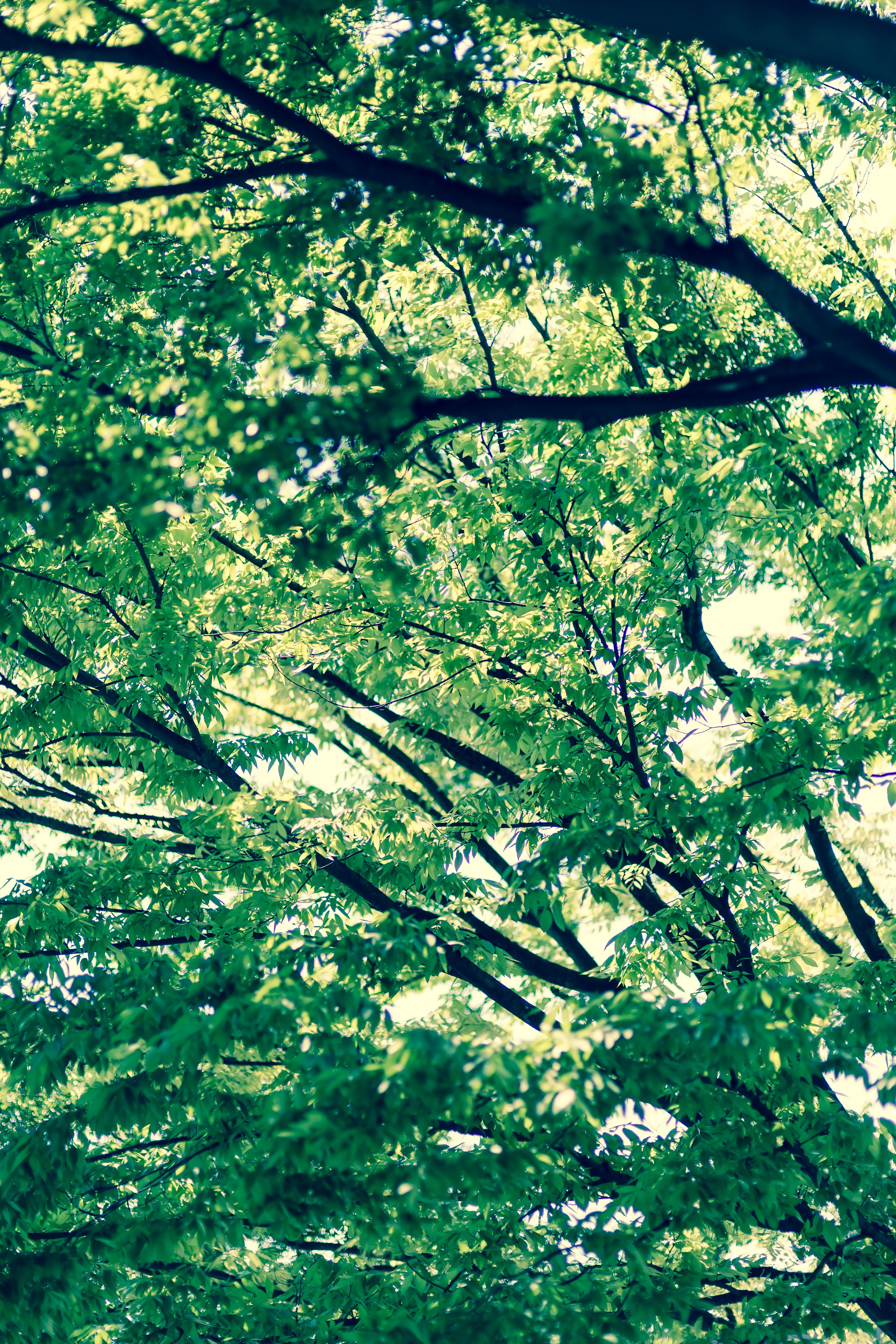 下から見上げる角度で撮影した、大木の枝と葉の写真素材です。黒い枝が放射状に広がり、明るい空が緑の葉の間から見えます。自然や森林浴の記事などにおすすめです。