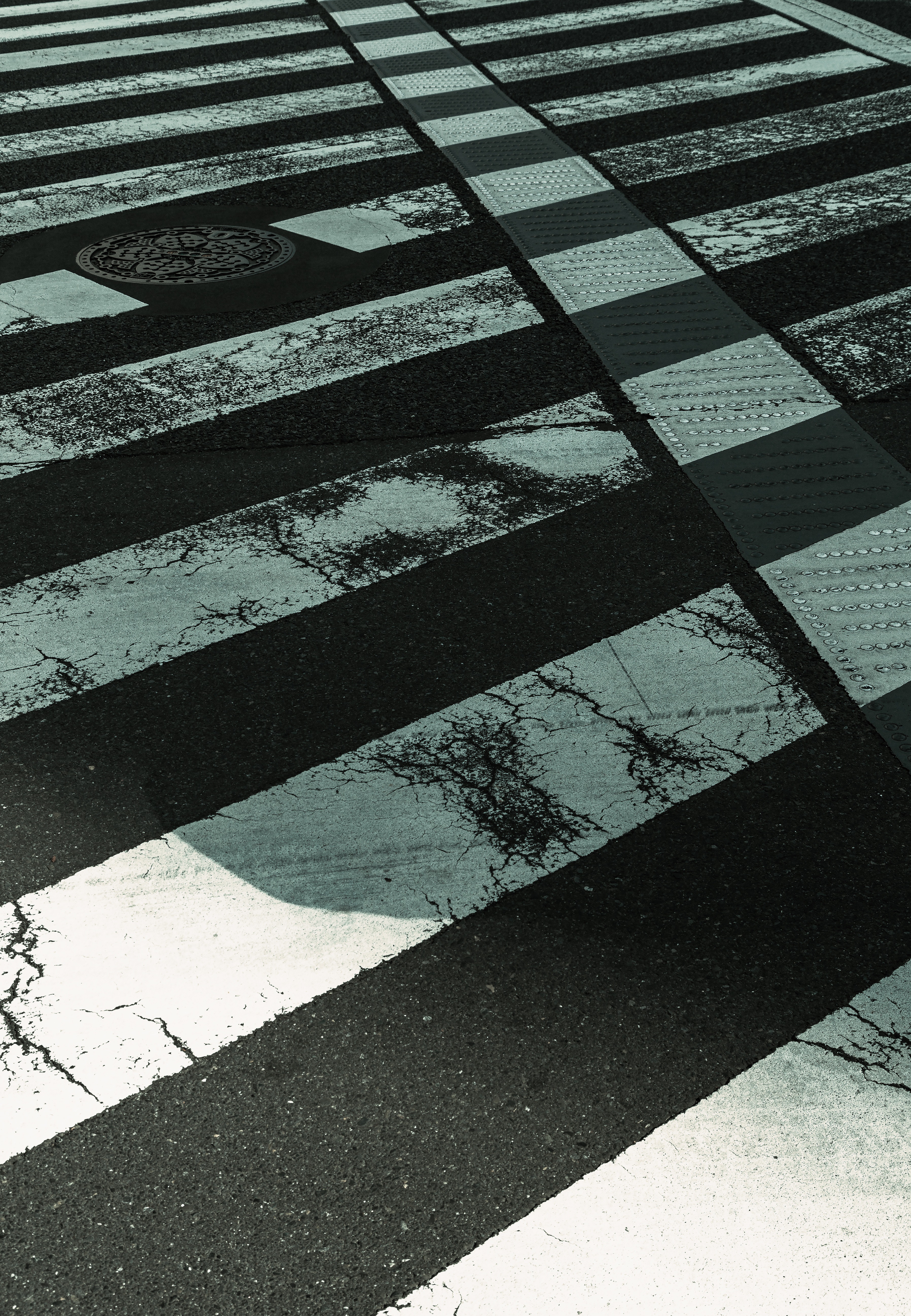 白線が交差する横断歩道の写真素材です。白いペイントとアスファルトが対比し、丸いマンホールの蓋も見えます。斜め上から撮影されています。都市風景や交通安全の記事などに使えます。