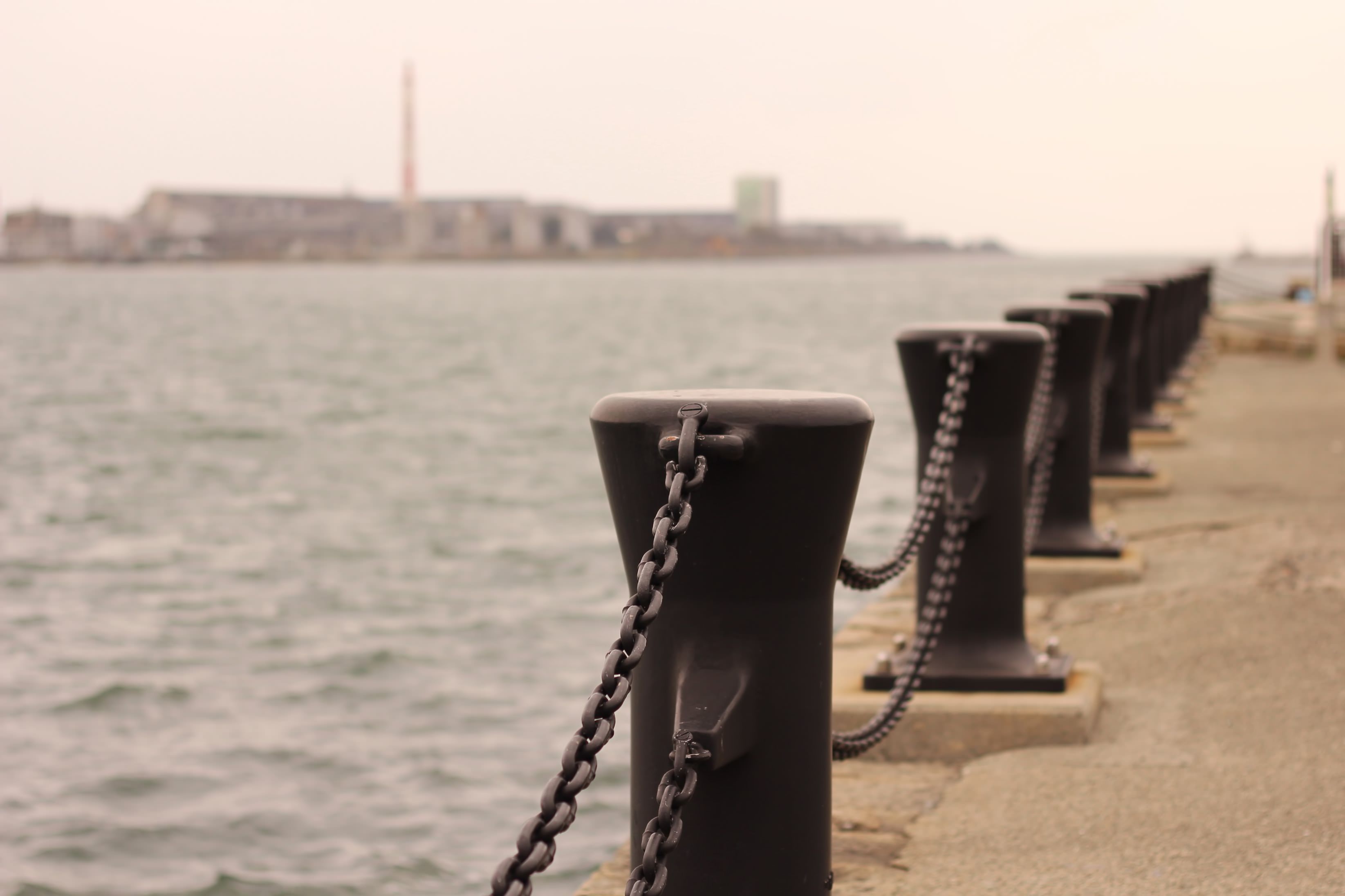 港の岸壁に並ぶ黒い係船柱の写真素材です。鉄製のボラードがチェーンで繋がれ、遠くに海と建物が霞んで見えます。港や海辺の風景記事などに使えます。
