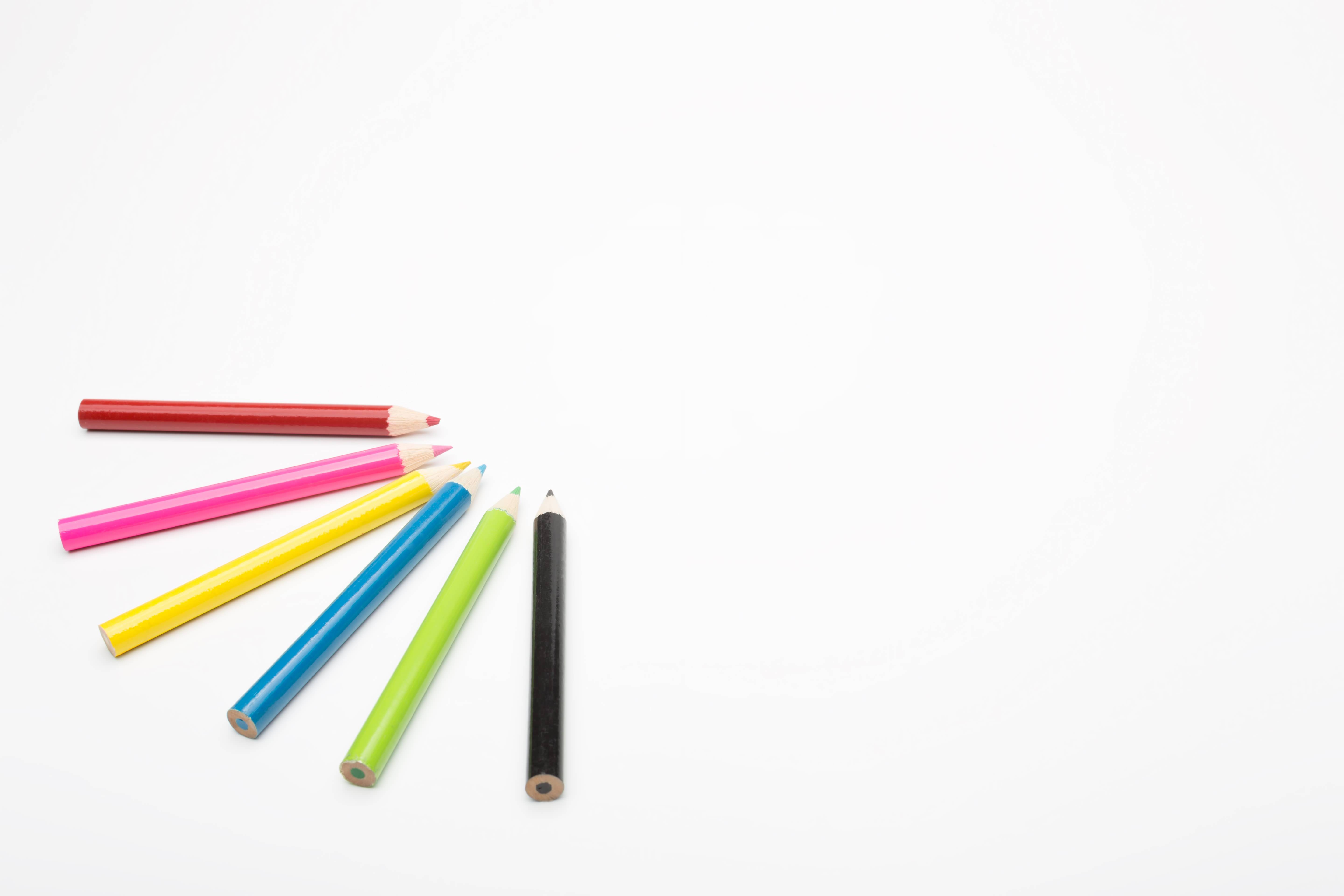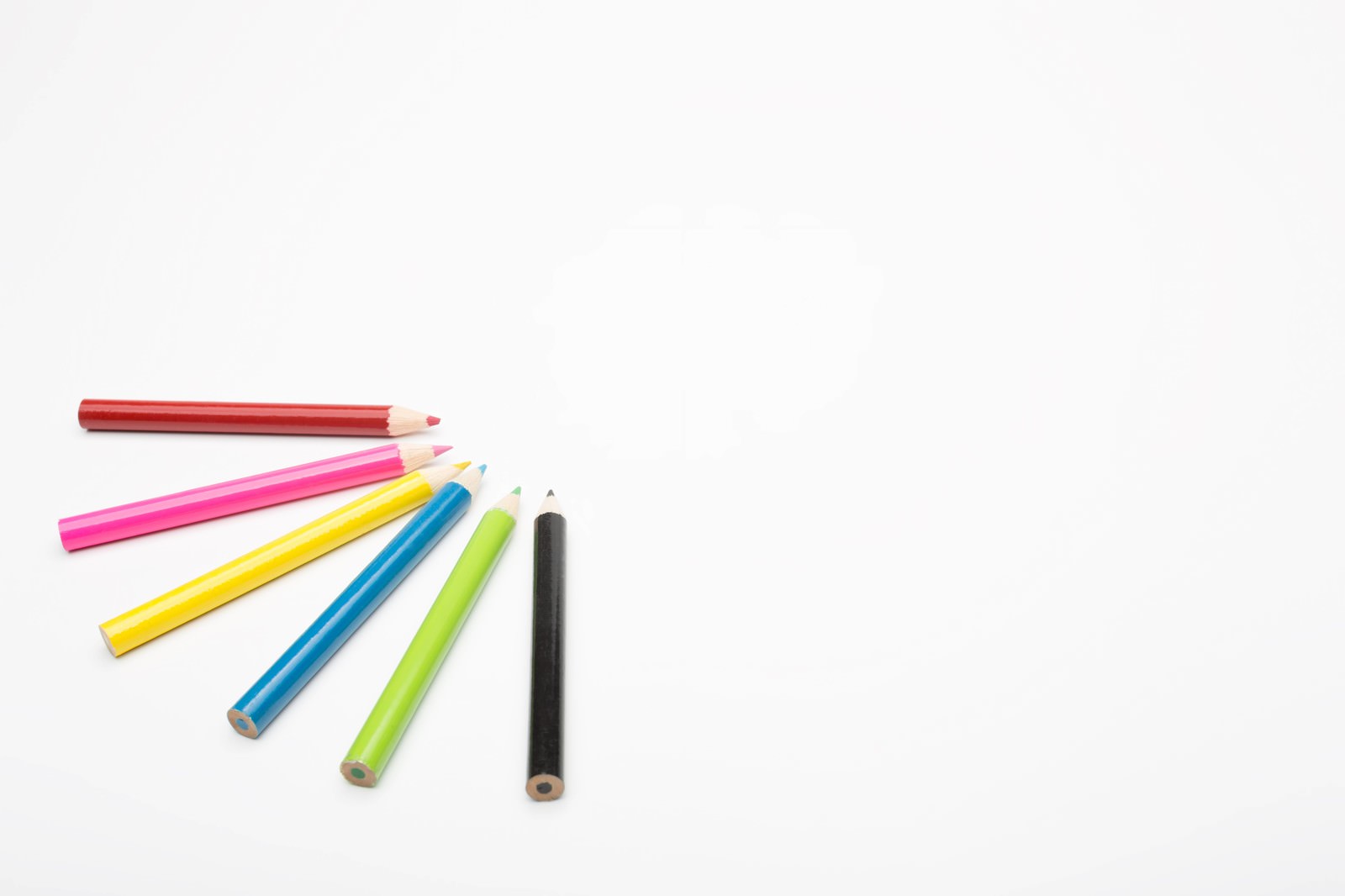 6色の色鉛筆が扇状に並んだ写真素材です。白い面に真上から撮影されたシンプルな構図です。文房具やお絵かきの記事などに使えます。
