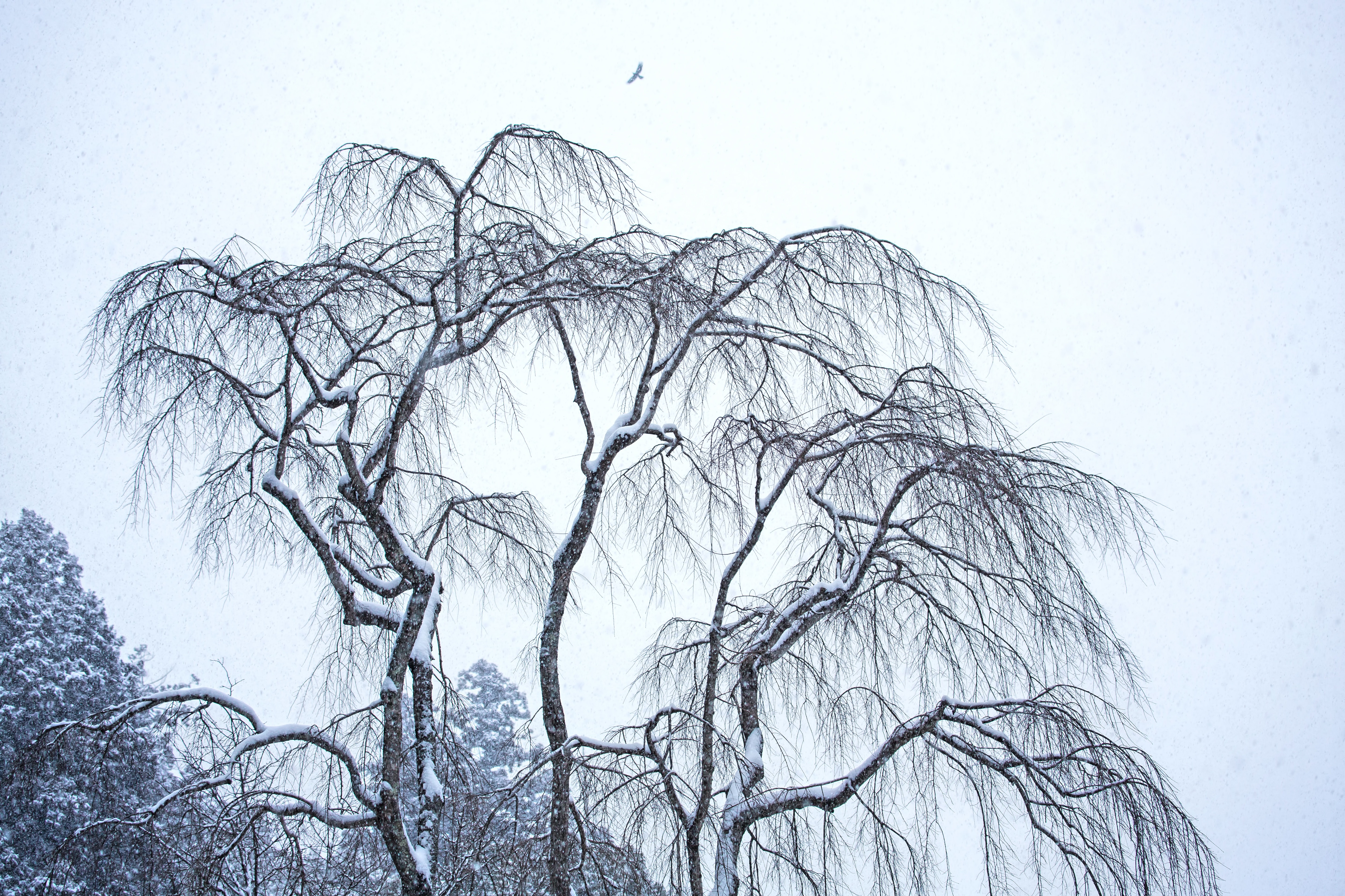降雪の中、枝垂れ木が雪をたっぷりと抱えた写真素材です。鳥が1羽、白くかすんだ空に飛ぶ姿も映り込んでいます。冬の自然素材や季節感を伝えるコンテンツにおすすめです。
