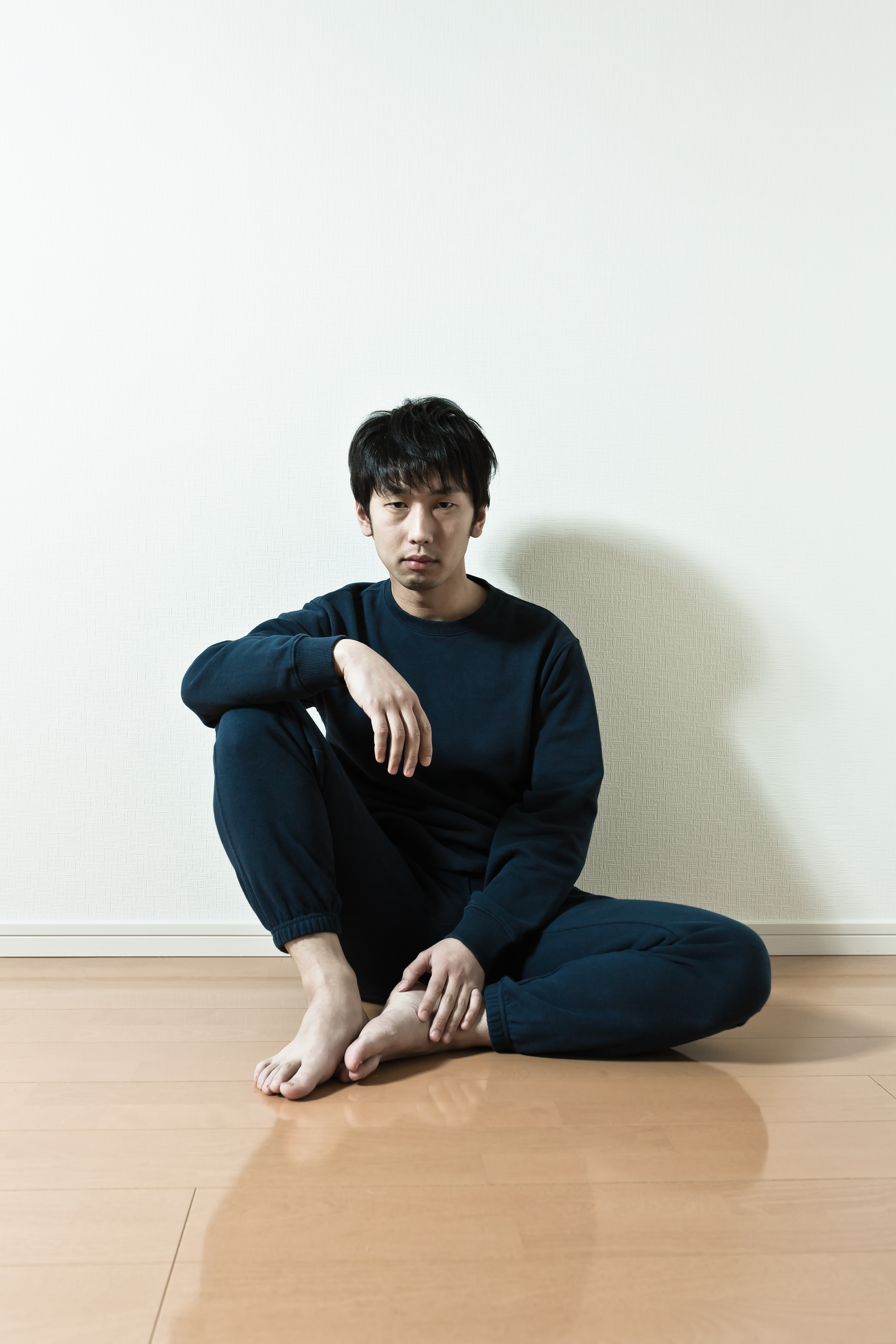 紺色のスウェット上下を着た男性が白い壁と木目の床の室内で床に座っている写真素材です。片膝を立てて裸足でくつろいだ姿勢です。一人暮らしやカジュアルウェアのコンテンツなどにおすすめです。