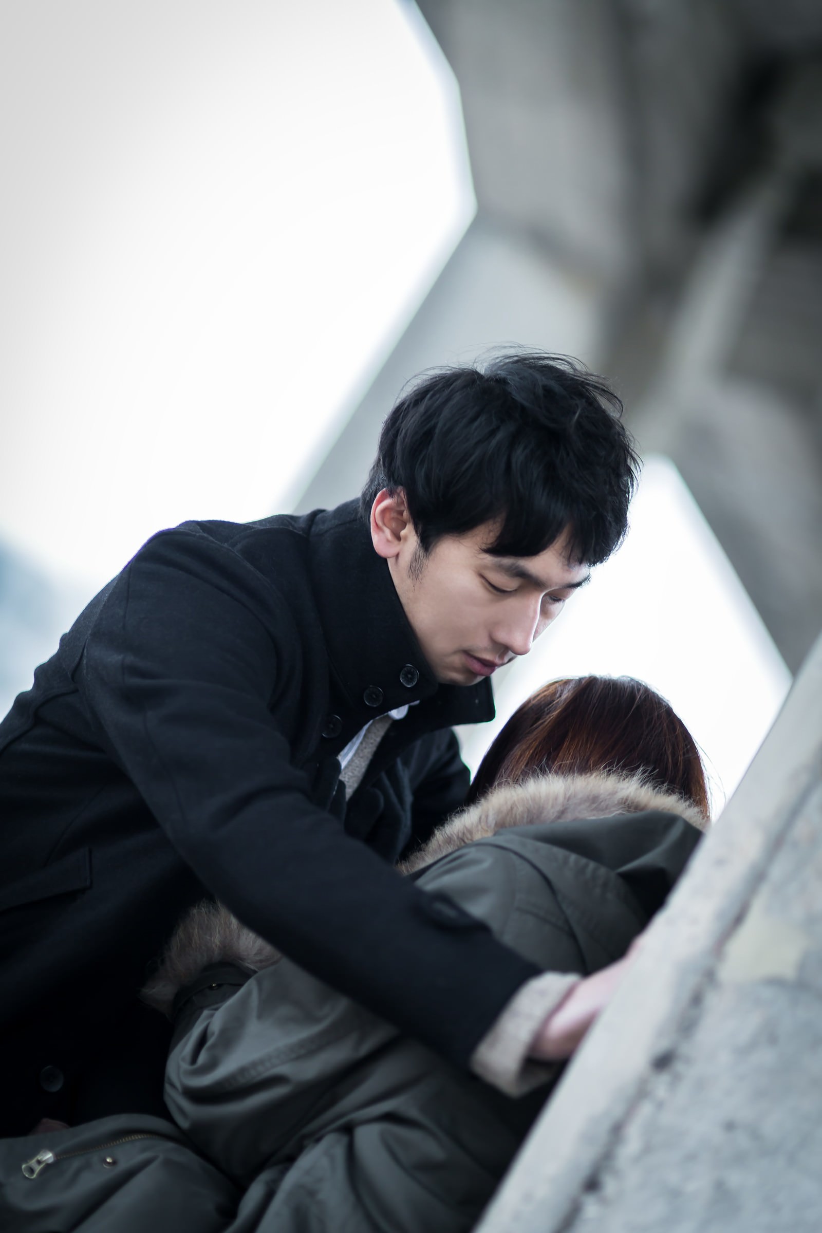 冬の昼間、白い壁を背景にカップルがキスをする写真素材です。黒いコート姿の男性が女性を壁に寄せ、茶色い髪の女性と目を閉じた二人が唇を重ねる親密な瞬間です。ラブストーリーやロマンス関連のWebサイト、恋愛コンテンツやカップル向けデザイン素材におすすめです。