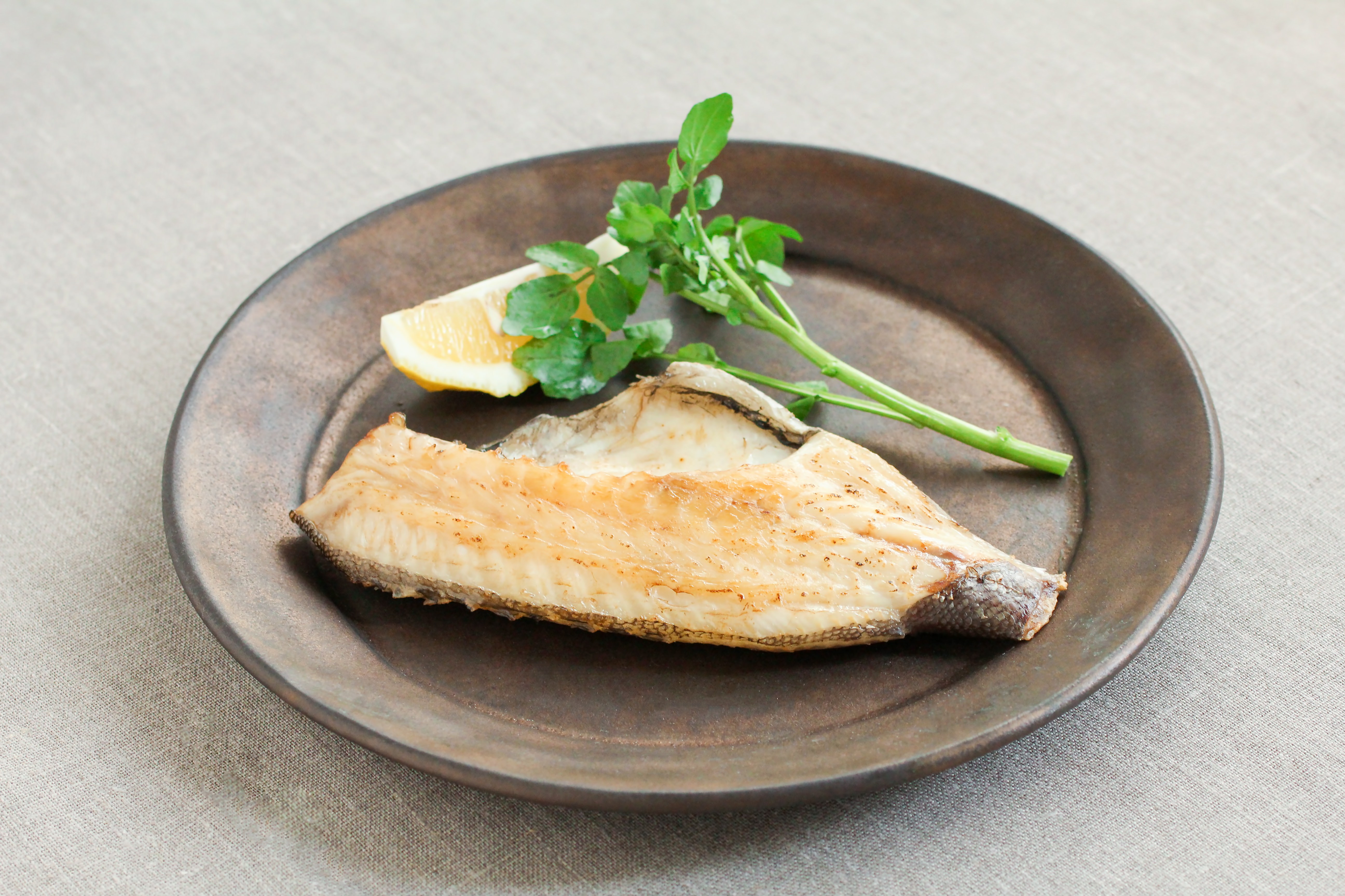 茶色の丸皿に焼き魚が1切れ盛られ、レモンスライスと緑の葉野菜が添えられている写真素材です。ベージュの布の上で斜め上から撮影されています。和食や健康的な食事のコンテンツなどにおすすめです。