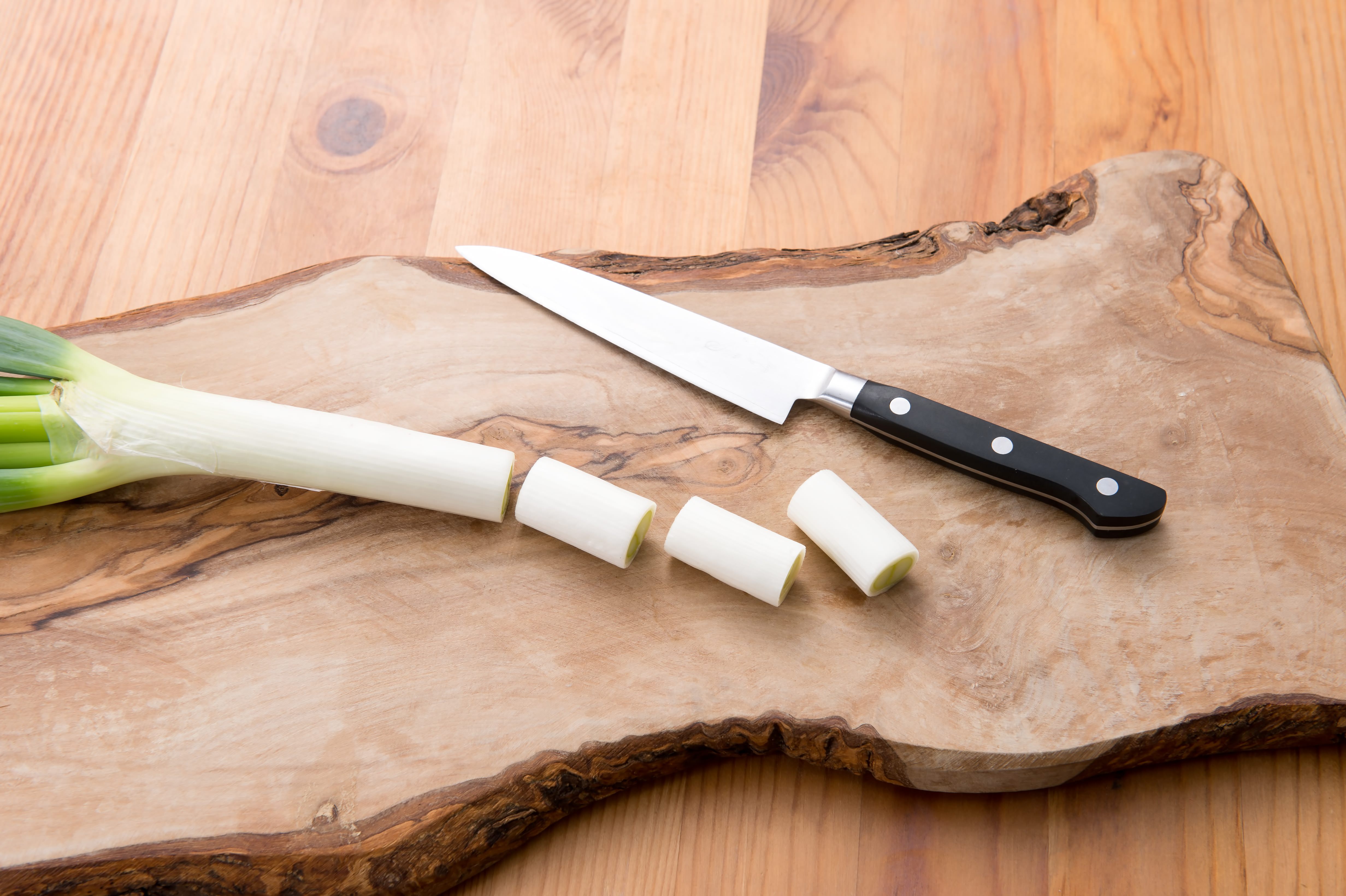 木製まな板の上に長ネギ1本と輪切りにされた数片が並び、銀色の刃の包丁が添えられている写真素材です。斜め上から撮影され、自然光が当たっています。料理の下ごしらえや和食のコンテンツなどにおすすめです。