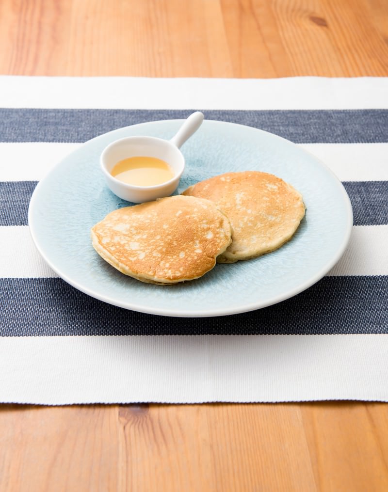 青みがかった白い皿にホットケーキ2枚が盛られ、粉砂糖がかかっている写真素材です。小さな容器に黄色いシロップが添えられ、ストライプ柄のランチョンマットの上で撮影されています。朝食やカフェのコンテンツなどにおすすめです。