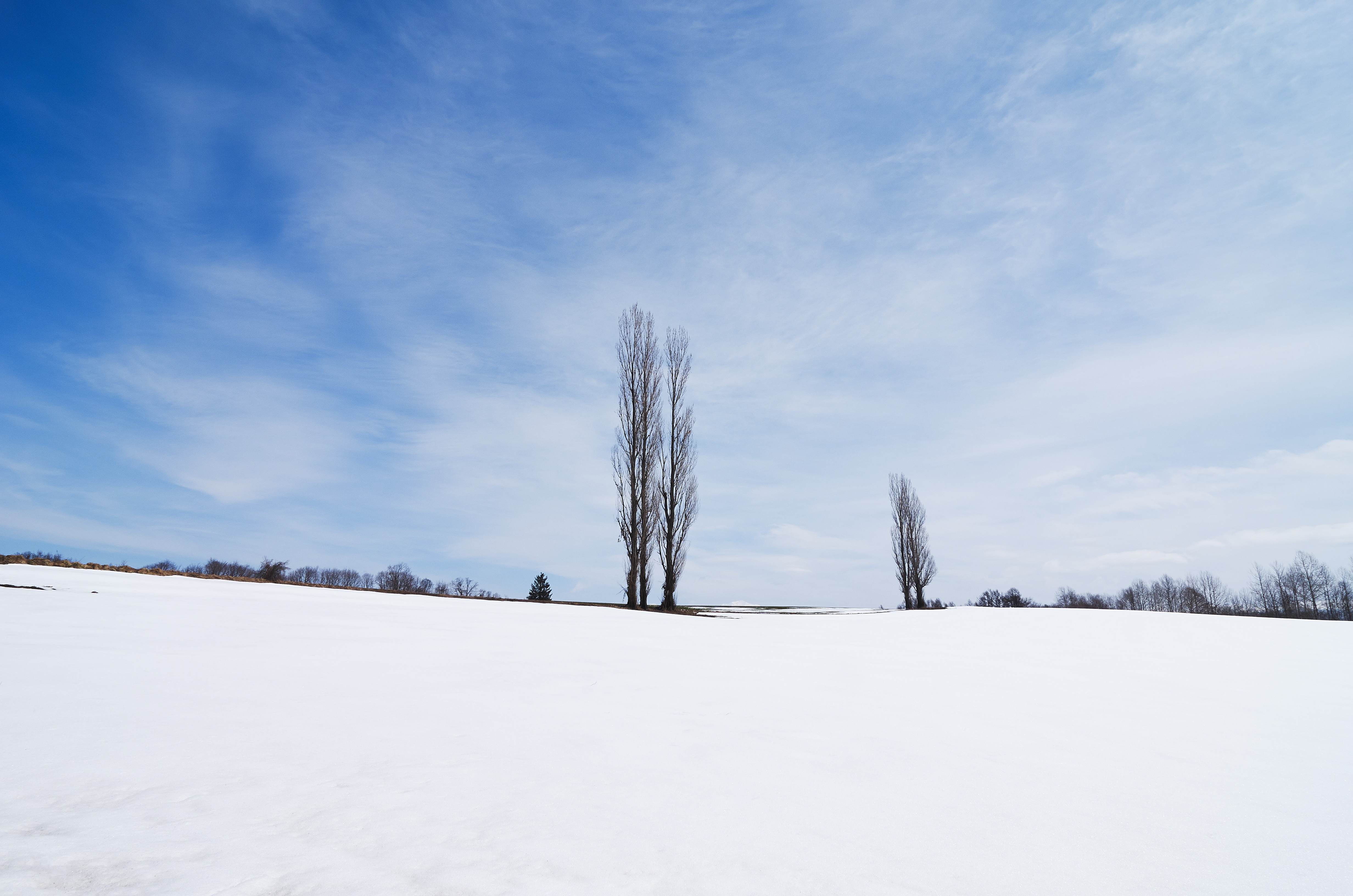 雪原に2本の細長いポプラの木が葉を落とした姿で立っている写真素材です。青空と白い雲が広がり、遠くに他の木々が見えます。冬の風景や自然関連のコンテンツなどにおすすめです。