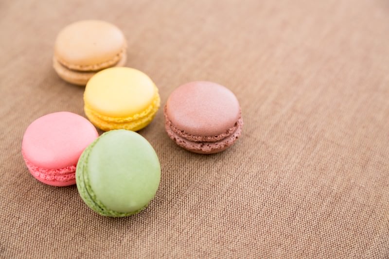 カラフルなマカロン5個がベージュの布の上に並んでいる写真素材です。斜め上からのアングルで手前にピントが合っています。お菓子やカフェのコンテンツにおすすめです。
