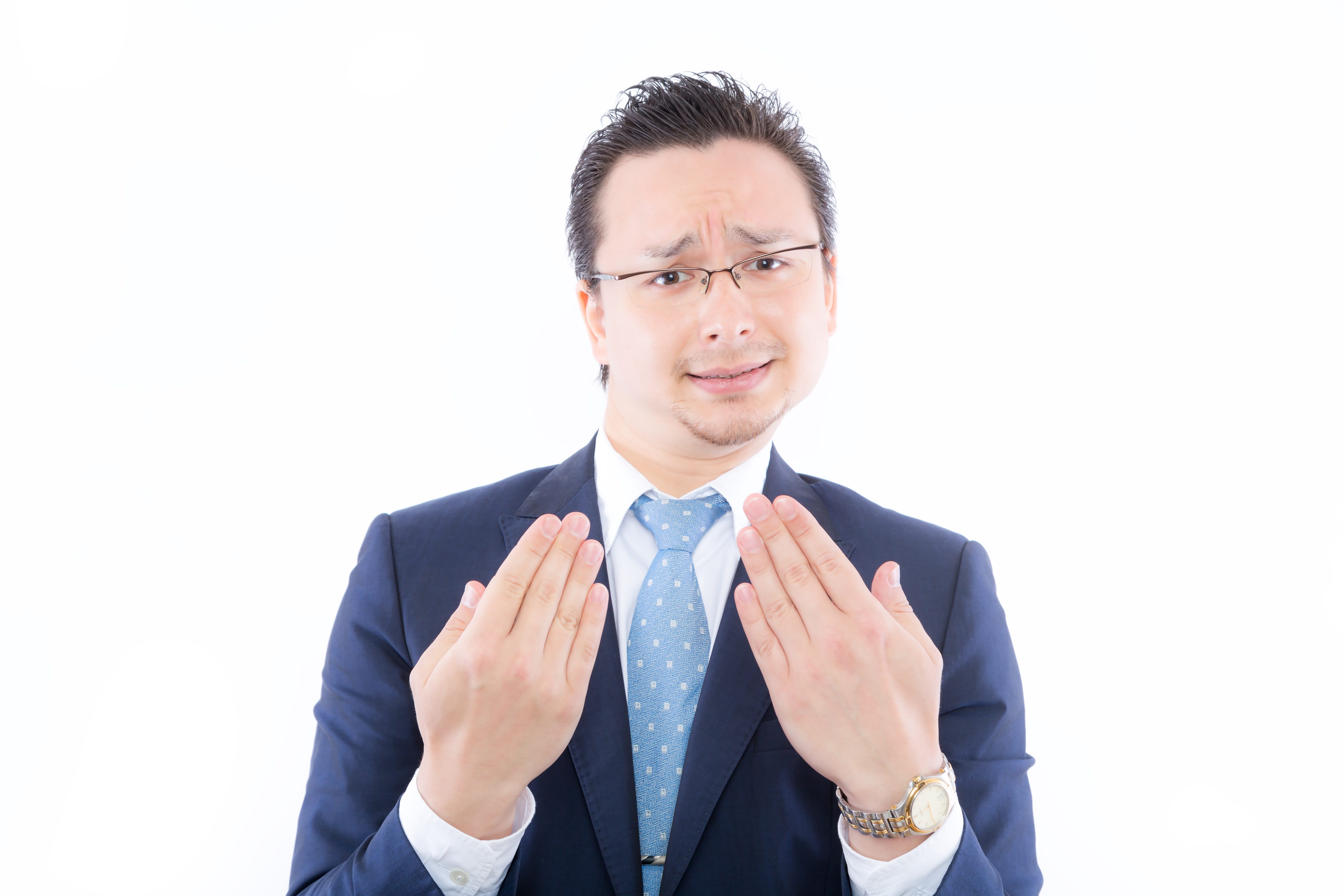 スーツ姿の男性が両手を広げ、困り顔で訴えかけているポーズの写真素材です。眉を寄せた表情と手のひらを上向きにしたポーズが、懇願や弁明の場面をコミカルに伝えます。ジョジョネタやビジネス系のユーモラスなコンテンツにおすすめです。