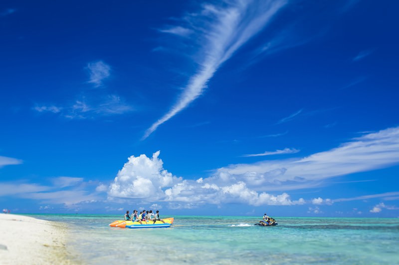 沖縄の海とバナナボートの観光客