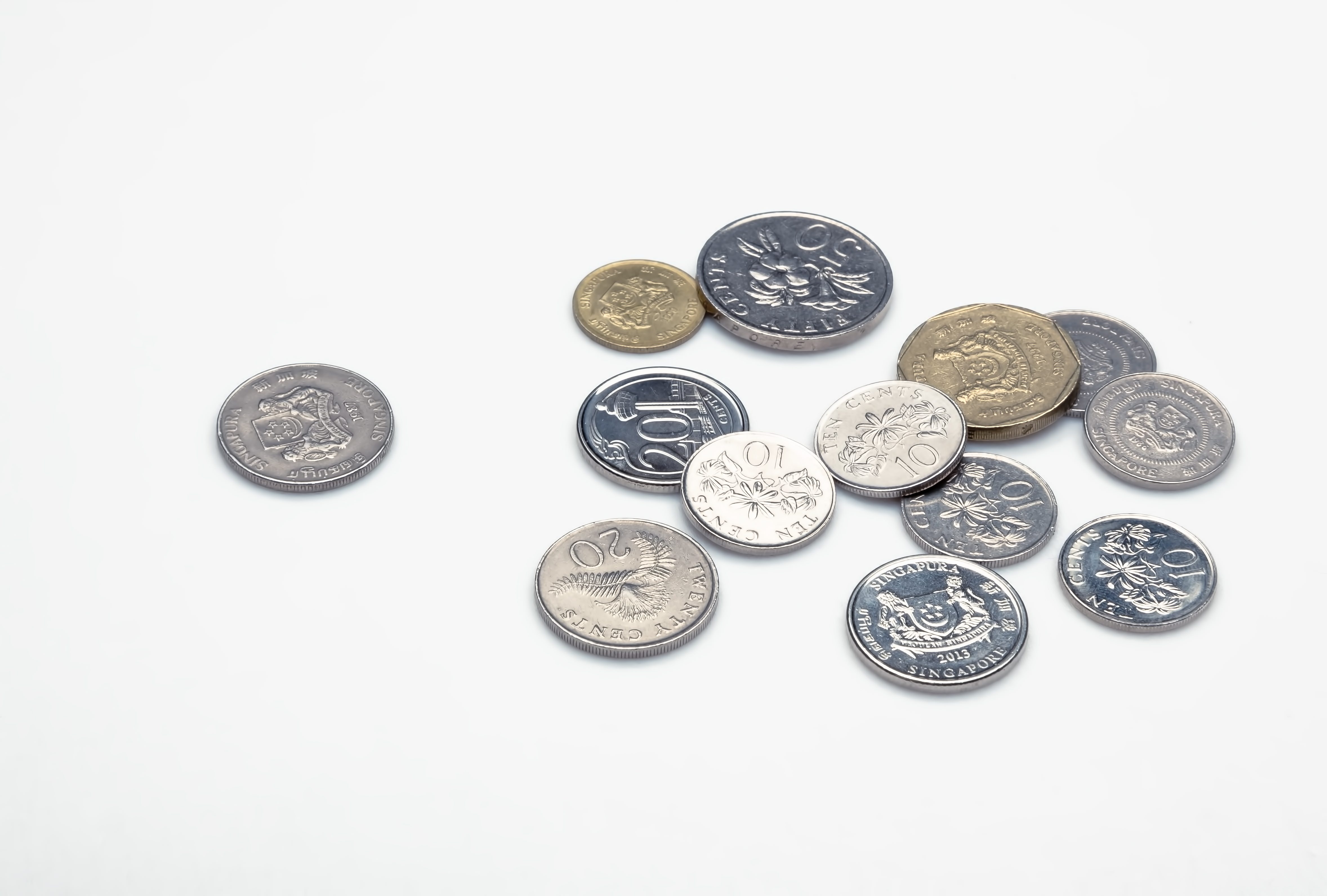 Scattered Singapore Coins on White Background