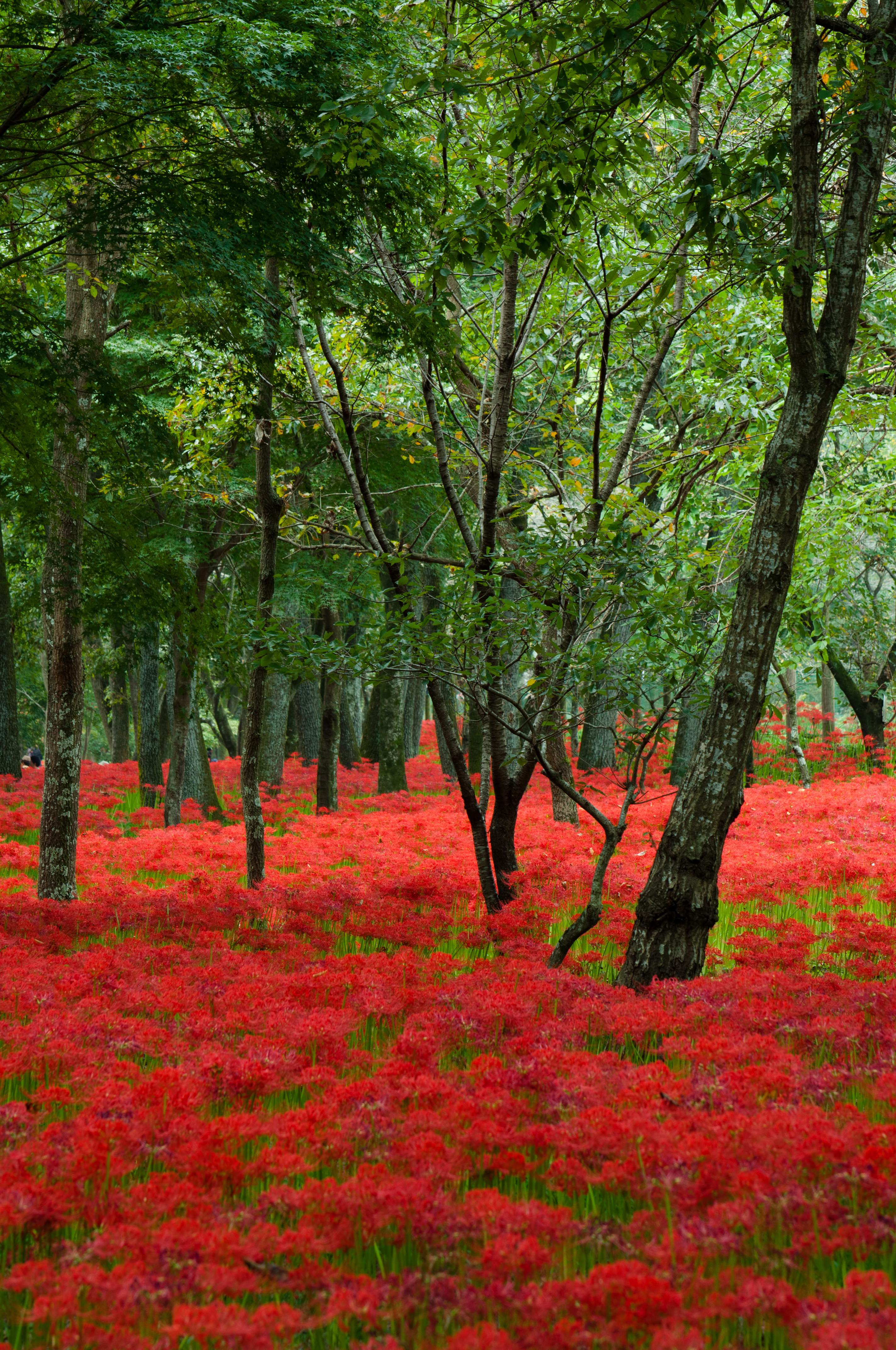 埼玉県日高市の巾着田に咲く曼珠沙華の写真素材です。雑木林の地面いっぱいに赤い彼岸花が群生し、太い幹が前後に並んでいます。秋の季節コンテンツや観光PR素材に使えます。
