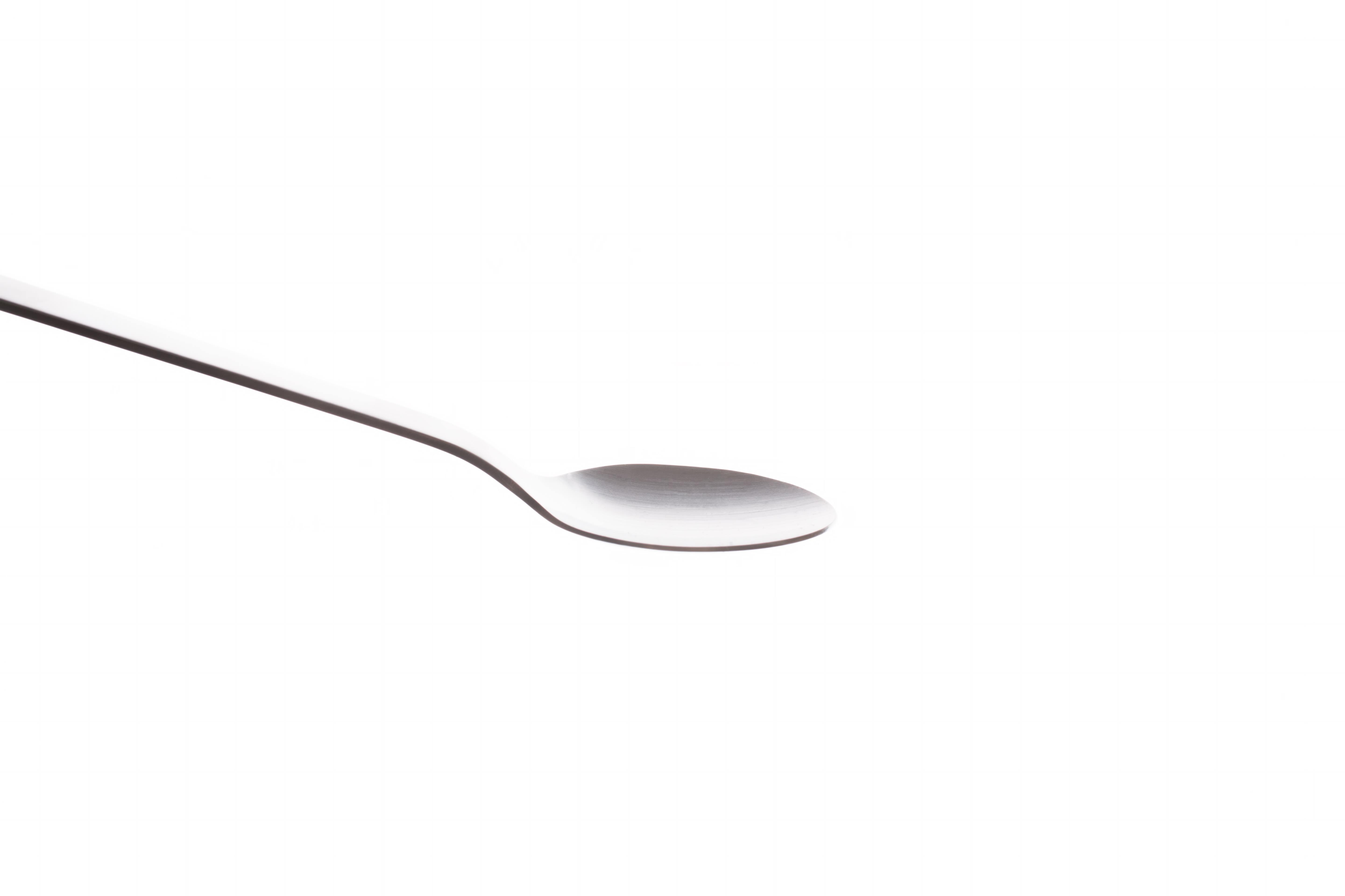 白い背景に置かれた銀色のスプーンの写真素材です。黒いハンドル部分から金属製のスプーン部分へと緩やかにカーブしており、楕円形で浅いくぼみを持つ計量用メタルスプーンです。料理や調理関連のコンテンツ、キッチン用品の紹介、レシピ記事などにおすすめです。
